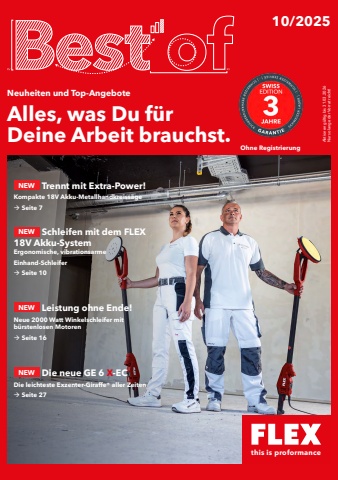 10/2025Neuheiten und Top-AngeboteAlles, was Du f%u00fcrDeine Arbeit brauchst. Aktionen g%u00fcltig bis 31.03.2026 Nur solange der Vorrat reicht!this is proformanceOhne RegistrierungNEW Trennt mit Extra-Power!Kompakte 18V Akku-Metallhandkreiss%u00e4ge%ufffd Seite 7NEW Schleifen mit dem FLEX 18V Akku-SystemErgonomische, vibrationsarme Einhand-Schleifer%ufffd Seite 10NEW Leistung ohne Ende!Neue 2000 Watt Winkelschleifer mit b%u00fcrstenlosen Motoren%ufffd Seite 16NEW Die neue GE 6 X-ECDie leichteste Exzenter-Giraffe%u00ae aller Zeiten%ufffd Seite 27