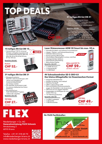 Ihr FLEX Fachh%u00e4ndler:Niederberger + Co. AGGeneralvertretung FLEX SchweizAmstutzweg 26010 KriensTelefon +41 41 318 60 70info@niederberger-kriens.chwww.niederberger-kriens.chTOP DEALS %u0083 Variable Einrichtung des InhaltsFLEX STACKPACK%u2122 ineinander stapelbar%u0083 (LQIDFKHV%u0003%u009c%u012aQHQ%u0003GXUFK%u00037DVWH%u0083 Feste Verriegelung der Stapelfunktion41-teiliges Bit-Set DB 41Bestell-Nr. 530.494%u0083 1%u201c (25 mm): PH1, 2x PH2, PH3, PZ1, PZ2, PZ3, PZ4, SL3, SL4, SL5, SL6, T10, T15, 2x T20, je 3x T25/T27/T30, T40. 2%u201c (50 mm): T15, je 2x T20/T25/T30, T40. Magnethalter 1-7/8%u201c: 8, 10, 13 mm. Universal Magnethalterung 6%u201c und Standard MagnethalterTOP DEALCHF 59.%u2013exkl. MwSt.4V Schraubendreher SD 5-300 4.0Der kleine Alltagshelfer im Hosentaschen-FormatBestell-Nr. 530.728%u0083 1x USB-C Ladekabel%u0083 1x Bit-Schlitz%u0083 1x Bit-Kreuzschlitz%u0083 Integrierte Arbeitsleuchte%u0083 Schalter f%u00fcr Rechts- und Linkslauf%u0083 6RIW%u0010*ULS%u0003+DQGJUL%u012a%u0083 USB-C Ladeanschluss 12W%u0083 Drei verschiedene Drehmomentstufen sorgen f%u00fcr Flexibilit%u00e4t in der Anwendung%u0083 300 U/min f%u00fcr ein z%u00fcgiges Arbeiten%u0083 $XVJHVWDWWHW%u0003PLW%u0003*UL%u012aULSSHQ%u0003I%u0113U%u0003HLQH%u0003sichere F%u00fchrung%u0083 1/4\TOP DEALCHF 49.%u2013exkl. MwSt. + vRB. (1.46)31-teiliges Bit-Set DB 31Bestell-Nr. 533.103%u0083 Massgeschneidertes Bitset f%u00fcr viele Anwendungen, sehr robust und schlagfest mit Aussensechskantschaft der Gr%u00f6sse 1/4 Zoll.%u0083 Die spezielle Torsionszone sorgt f%u00fcr extreme Haltbarkeit bei Dauerbelastung.%u0083 Box passend zum FLEX STACKPACK%u2122 System, aufeinander stapelbar.TOP DEALCHF 27.%u2013exkl. MwSt.15-teiliges Bit-Set DB 15%u0083 Steckschl%u00fcssel 7/8/10, Universal Bithalter schlagfest magnetisch 60 mm, Multimaterial Bohrer %u00d84x100, %u00d85x100, %u00d8 6x100, %u00d8 8x120 mm, %u00d8 10x 120 mmBestell-Nr. 534.463NeuheitCHF 52.%u2013exkl. MwSt.Laser Distanzmesser ADM 30 Smart bis max. 30 mBestell-Nr. 504.599%u0083 1x ADM 30 Smart%u0083 1x Handschlaufe%u0083 1x USB-Kabel%u0083 Schnelles Ermitteln vom Aufmass im Innenbereich%u0083 L%u00e4ngen-, Fl%u00e4chen- und Volumenberechnung%u0083 InDirekte H%u00f6henmessung%u0083 Kontinuierlicher Messmodus%u0083 Umschaltbare Massangabe in m/mm, Inch/Feet%u0083 Staubgesch%u00fctztes Geh%u00e4use%u0083 Automatische Abschaltung%u0083 Beleuchtetes Display Aktion statt CHF 75.%u2013CHF 59.%u2013exkl. MwSt. + vRB. (0.49) %u2022 Elektrowerkzeuge %u2022 Rasenm%u00e4her %u2022 Benzin-Ger%u00e4te %u2022 Kleinger%u00e4te %u2022 Verkauf und Rep.Fux Elektrowerkzeuge GmbHDorfstrasse 20b %u2022 4444 R%u00fcmlingen062 791 44 44079 247 44 44062 299 26 74Telefon:Natel:Fax:info@fuxtools.ch %u2022 www.fuxtools.ch