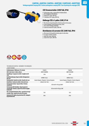 WWW.BRENNENSTUHL.COM 105CAMPING %u2022 MARITIM/CAMPING %u2022 MARITIME/CAMPEGGIO %u2022 MARITTIMOVerl%u00e4ngerungskabel Camping (CEE)/ Cordons prolongateurs camping (CEE)/ Cavo di prolunga da campeggio (CEE)CAMPING %u2022 MARITIM/CAMPING %u2022 MARITIME/CAMPEGGIO %u2022 MARITTIMOVerl%u00e4ngerungskabel Camping (CEE)/ Cordons prolongateurs camping (CEE)/ Cavo di prolunga da campeggio (CEE)CEE Stromverteiler 230V/16A, IP44%u25a0 Hochwertiger schlag- und bruchfester Steckdosenblock.%u25a0 Mit einklappbarem Metallhaken.%u25a0 Stecker CEE 3-polig, 230V/16A.%u25a0 4 Steckdosen CEE 3-polig, 230V/16A.Rallonge CEE %u00e0 3-p%u00f4les 230V, IP 44%u25a0 Bloc de prises de grande qualit%u00e9, r%u00e9sistant aux chocs et %u00e0 la cassure.%u25a0 4 prises prot%u00e9g%u00e9es contre projections d%u2019eau, 230 V.%u25a0 Avec crochet m%u00e9tallique rabattable.%u25a0 4 prises de courant CEE 3 p%u00f4les, 230V/16A.Distributore di corrente CEE 230V/16A, IP44%u25a0 Blocco presa di alta qualit%u00e0 resistente agli urti e alla rottura.%u25a0 Con gancio metallico retrattile.%u25a0 Spina CEE a 3 poli, 230V/16A.%u25a0 4 prese CEE a 3 poli, 230V/16A.ROBUSTSPECIALIP44 CEE 230 VCEE 230 VTECHNISCHE DATEN / DONN%u00c9ES TECHNIQUES / DATI TECNICIArtikelnummer/ R%u00e9f%u00e9rence / N%u00b0 articolo 1166318 1166328EAN/ Code-barre / Codice a Barre 4007123180998 4007123181001Kabell%u00e4nge / Longueur de c%u00e2ble / Lunghezza del cavo10 m 25 mKabelbezeichnung / Type de c%u00e2ble / Designazione del cavo H07RN-F 3G2,5 H07RN-F 3G2,5Kabelqualit%u00e4t/ Qualit%u00e9 du c%u00e2ble / Qualit%u00e0 del cavo Gummi-Neopren / N%u00e9opr%u00e8ne/ Gomma-Neoprene Gummi-Neopren / N%u00e9opr%u00e8ne/ Gomma-NeopreneKabelfarbe / Couleur du c%u00e2ble / Colore del cavo schwarz/ noir/ nero schwarz/ noir/ neroStecksystem Stecker/ Type de fiche / Sistema connettore CEE 16A 2P+PE (3p) 230VVStecksystem CEE-Steckdose / Type de prise de courant CEE/ Sistema a spina Presa CEE/ Accoppiamento CEECEE 4x 16A 2P+PE (3p) 230VMax. Strombelastbarkeit/ Max. capacit%u00e9 de charge actuelle / Max. capacit%u00e0 di carico di corrente 16 A 16 ASchutzart (IP)/ Indice de protection (IP)/ Categoria di protezione (IP) IP44 IP44