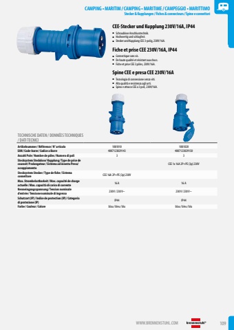 WWW.BRENNENSTUHL.COM 109CAMPING %u2022 MARITIM/CAMPING %u2022 MARITIME/CAMPEGGIO %u2022 MARITTIMOStecker & Kupplungen / Fiches & connecteurs/ Spine e connettoriCAMPING %u2022 MARITIM/CAMPING %u2022 MARITIME/CAMPEGGIO %u2022 MARITTIMOStecker & Kupplungen / Fiches & connecteurs/ Spine e connettoriCEE-Stecker und Kupplung 230V/16A, IP44%u25a0 Schraublose Anschlusstechnik.%u25a0 Hochwertig und schlagfest.%u25a0 Stecker und Kupplung CEE 3-polig, 230V/16A.Fiche et prise CEE 230V/16A, IP44%u25a0 Connectique sans vis.%u25a0 De haute qualit%u00e9 et r%u00e9sistant aux chocs.%u25a0 Fiche et prise CEE 3 p%u00f4les, 230V/16A.Spine CEE e presa CEE 230V/16A%u25a0 Tecnologia di connessione senza viti.%u25a0 Alta qualit%u00e0 e resistenza agli urti.%u25a0 Spina e attacco CEE a 3 poli, 230V/16A.TECHNISCHE DATEN / DONN%u00c9ES TECHNIQUES / DATI TECNICIArtikelnummer/ R%u00e9f%u00e9rence / N%u00b0 articolo 1081010 1081020EAN/ Code-barre / Codice a Barre 4007123029143 4007123029150Anzahl Pole / Nombre de p%u00f4les/ Numero di poli 3 3Stecksystem Steckdose/ Kupplung / Type de prise de courant/ Prolongateur/ Sistema ad innesto Presa/ accoppiamentoCEE 1x 16A 2P+PE (3p) 230VStecksystem Stecker/ Type de fiche / Sistema connettore CEE 16A 2P+PE (3p) 230VMax. Strombelastbarkeit/ Max. capacit%u00e9 de charge actuelle / Max. capacit%u00e0 di carico di corrente 16 A 16 ANenneingangsspannung / Tension nominale d%u2019entr%u00e9e / Tensione nominale di ingresso 230 V / 230 V~ 230 V / 230 V~Schutzart (IP)/ Indice de protection (IP)/ Categoria di protezione (IP) IP44 IP44Farbe / Couleur/ Colore blau/ bleu/ blu blau/ bleu/ blu
