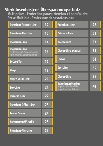 Premium-Protect-Line 12Premium-Alu-Line 13Premium-Line 14Premium-LineF%u00fcr Netzwerk & Serverschr%u00e4nkeFor Network & Server Cabinets16Secure-Tec 17Hugo 19Super-Solid-Line 20Eco-Line 21Primera-Line 22Premium-Office-Line 23Tower Power 24brennenstuhl%u00aeestilo 25Premium-Alu-Line 26Premium-Line 27Primera-Line 31Bremounta 32Clever-Line schmal 33Ecolor 34Eco-Line 35Clever-Line 36KabelorganisationOrganisation des c%u00e2bles Organizzazione dei cavi41Multiprises %u00b7 Protection parasurtension et parafoudreSteckdosenleisten %u00b7 %u00dcberspannungsschutz Prese Multiple %u00b7 Protezione da sovratensione
