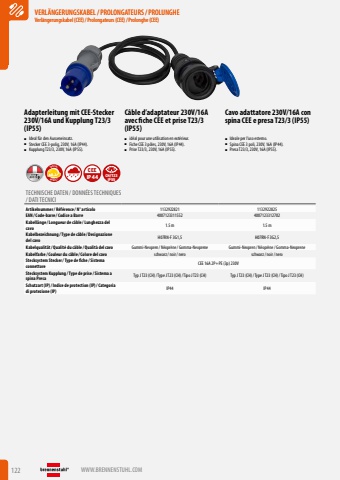 122 WWW.BRENNENSTUHL.COMVERL%u00c4NGERUNGSKABEL/PROLONGATEURS/PROLUNGHEVerl%u00e4ngerungskabel (CEE)/ Prolongateurs (CEE)/ Prolonghe (CEE)VERL%u00c4NGERUNGSKABEL/PROLONGATEURS/PROLUNGHEVerl%u00e4ngerungskabel (CEE)/ Prolongateurs (CEE)/ Prolonghe (CEE)Adapterleitung mit CEE-Stecker 230V/16A und Kupplung T23/3 (IP55)C%u00e2ble d%u2019adaptateur 230V/16A avec fiche CEE et prise T23/3 (IP55)Cavo adattatore 230V/16A con spina CEE e presa T23/3 (IP55)%u25a0 Ideal f%u00fcr den Ausseneinsatz.%u25a0 Stecker CEE 3-polig, 230V, 16A (IP44).%u25a0 Kupplung T23/3, 230V, 16A (IP55).%u25a0 id%u00e9al pour une utilisation en ext%u00e9rieur.%u25a0 Fiche CEE 3 p%u00f4les, 230V, 16A (IP44).%u25a0 Prise T23/3, 230V, 16A (IP55).%u25a0 Ideale per l%u2019uso esterno.%u25a0 Spina CEE 3 poli, 230V, 16A (IP44).%u25a0 Presa T23/3, 230V, 16A (IP55).ROBUSTSPECIALIP44CEECH/T23IP55TECHNISCHE DATEN / DONN%u00c9ES TECHNIQUES / DATI TECNICIArtikelnummer/ R%u00e9f%u00e9rence / N%u00b0 articolo 1132922821 1132922825EAN/ Code-barre / Codice a Barre 4007123311552 4007123312702Kabell%u00e4nge / Longueur de c%u00e2ble / Lunghezza del cavo1.5 m 1.5 mKabelbezeichnung / Type de c%u00e2ble / Designazione del cavo H07RN-F 3G1,5 H07RN-F 3G2,5Kabelqualit%u00e4t/ Qualit%u00e9 du c%u00e2ble / Qualit%u00e0 del cavo Gummi-Neopren / N%u00e9opr%u00e8ne/ Gomma-Neoprene Gummi-Neopren / N%u00e9opr%u00e8ne/ Gomma-NeopreneKabelfarbe / Couleur du c%u00e2ble / Colore del cavo schwarz/ noir/ nero schwarz/ noir/ neroStecksystem Stecker/ Type de fiche / Sistema connettore CEE 16A 2P+PE (3p) 230VStecksystem Kupplung / Type de prise / Sistema a spina Presa Typ J T23 (CH)/ Type J T23 (CH)/ Tipo J T23 (CH) Typ J T23 (CH)/ Type J T23 (CH)/ Tipo J T23 (CH)Schutzart (IP)/ Indice de protection (IP)/ Categoria di protezione (IP) IP44 IP44