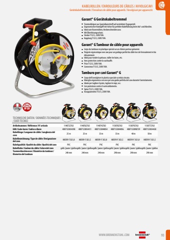 WWW.BRENNENSTUHL.COM 93KABELROLLEN /ENROULEURS DE C%u00c2BLES/ AVVOLGICAVIGer%u00e4tekabeltrommeln / Enrouleurs de c%u00e2ble pour appareils/ Avvolgicavi per apparecchiGarant%u00ae G Ger%u00e4tekabeltrommel%u25a0 Trommelk%u00f6rper aus Spezialkunststoff auf verzinktem Tragegestell.%u25a0 Ergonomischer Handgriff mit Achse f%u00fcr perfekte Kabelf%u00fchrung beim Auf- und Abrollen.%u25a0 Ideal zum Rasenm%u00e4hen, Heckenschneiden usw.%u25a0 Mit %u00dcberhitzungsschutz.%u25a0 Stecker T12/3, 230V/10A.%u25a0 Kupplung T13/3, 230V/10A.Garant%u00ae G Tambour de c%u00e2ble pour appareils%u25a0 Corps du tambour en plastique sp%u00e9cial sur un ch%u00e2ssis porteur galvanis%u00e9.%u25a0 Poign%u00e9e ergonomique avec axe pour un guidage parfait du c%u00e2ble lors de l%u2019enroulement et du d%u00e9roulement.%u25a0 Id%u00e9al pour tondre la pelouse, tailler les haies, etc.%u25a0 Avec protection contre la surchauffe.%u25a0 Prise T12/3, 230V/10A.%u25a0 Connecteur T13/3, 230V/10A.Tamburo per cavi Garant%u00ae G%u25a0 Corpo dell%u2019avvolgitore in plastica speciale su telaio zincato.%u25a0 Maniglia ergonomica con asse per una guida perfetta del cavo durante l%u2019arrotolamento.%u25a0 Ideale per tagliare il prato, tagliare le siepi, ecc.%u25a0 Con protezione contro il surriscaldamento.%u25a0 Spina T12/3, 230V/10A.%u25a0 Accoppiamento T13/3, 230V/10A.IP20TECHNISCHE DATEN / DONN%u00c9ES TECHNIQUES / DATI TECNICIArtikelnummer/ R%u00e9f%u00e9rence / N%u00b0 articolo 1140722763 1140762763 1140742763 1130782763 1130792763 1130772763EAN/ Code-barre / Codice a Barre 4007123054398 4007123054411 4007123044054 4007123044016 4007123098729 4007123054428Kabell%u00e4nge / Longueur de c%u00e2ble / Lunghezza del cavo25 m 25 m 33 m 33 m 40 m 50 mKabelbezeichnung / Type de c%u00e2ble / Designazione del cavo H05VV-F 3G1,0 H05VV-F 3G1,5 H05VV-F 3G1,0 H05VV-F 3G1,5 H05VV-F 3G1,0 H05VV-F 3G1,5Kabelqualit%u00e4t/ Qualit%u00e9 du c%u00e2ble / Qualit%u00e0 del cavo PVC PVC PVC PVC PVC PVCKabelfarbe / Couleur du c%u00e2ble / Colore del cavo gelb/ jaune/ gialloa gelb/ jaune/ gialloa gelb/ jaune/ gialloa gelb/ jaune/ gialloa gelb/ jaune/ gialloa gelb/ jaune/ gialloaTrommeldurchmesser/ Diam%u00e8tre du tambour/ Diametro del tamburo 240 mm 240 mm 240 mm 290 mm 290 mm 290 mm