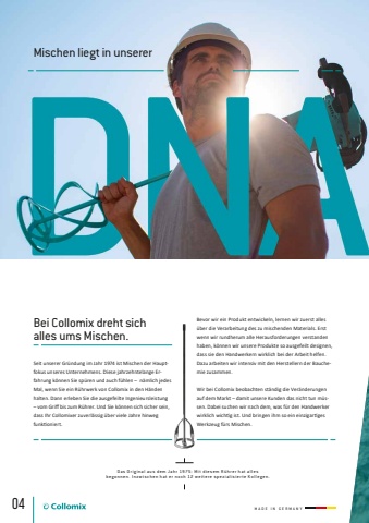 04Bei Collomix dreht sich alles ums Mischen. Bevor wir ein Produkt entwickeln, lernen wir zuerst alles %u00fcber die Verarbeitung des zu mischenden Materials. Erst wenn wir rundherum alle Herausforderungen verstanden haben, k%u00f6nnen wir unsere Produkte so ausgefeilt designen, dass sie den Handwerkern wirklich bei der Arbeit helfen. Dazu arbeiten wir intensiv mit den Herstellern der Bauchemie zusammen. Wir bei Collomix beobachten st%u00e4ndig die Ver%u00e4nderungen auf dem Markt %u2013 damit unsere Kunden das nicht tun m%u00fcssen. Dabei suchen wir nach dem, was f%u00fcr den Handwerker wirklich wichtig ist. Und bringen ihm so ein einzigartiges Werkzeug f%u00fcrs Mischen.Seit unserer Gr%u00fcndung im Jahr 1974 ist Mischen der Hauptfokus unseres Unternehmens. Diese jahrzehntelange Erfahrung k%u00f6nnen Sie sp%u00fcren und auch f%u00fchlen %u2013 n%u00e4mlich jedes Mal, wenn Sie ein R%u00fchrwerk von Collomix in den H%u00e4nden halten. Dann erleben Sie die ausgefeilte Ingenieursleistung %u2013 vom Griff bis zum R%u00fchrer. Und Sie k%u00f6nnen sich sicher sein, dass Ihr Collomixer zuverl%u00e4ssig %u00fcber viele Jahre hinweg funktioniert.D a s O r i g i n a l a u s d e m J a h r 1 9 7 5 : M i t d i e s e m R %u00fc h r e r h a t a l l e s b e g o n n e n . I n z w i s c h e n h a t e r n o c h 1 2 w e i t e r e s p e z i a l i s i e r t e K o l l e g e n . Mischen liegt in unsererMADE IN GERMANY