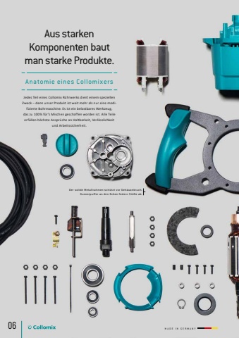 06Aus starken Komponenten baut man starke Produkte.Jedes Teil eines Collomix R%u00fchrwerks dient einem speziellen Zweck %u2013 denn unser Produkt ist weit mehr als nur eine modifizierte Bohrmaschine. Es ist ein belastbares Werkzeug, das zu 100% f%u00fcr%u2019s Mischen geschaffen worden ist. Alle Teile erf%u00fcllen h%u00f6chste Anspr%u00fcche an Haltbarkeit, Verl%u00e4sslichkeit und Arbeitssicherheit. Anatomie eines CollomixersDer solide Metallrahmen sch%u00fctzt vor Geh%u00e4usebruch. Gummipuffer an den Ecken federn S t%u00f6%u00dfe ab. MADE IN GERMANY