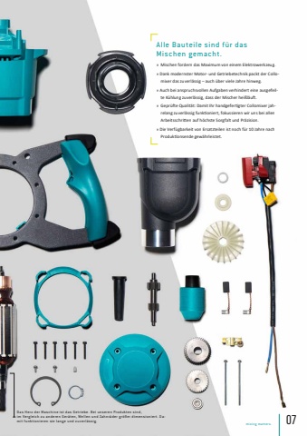 07%u00bbMischen fordern das Maximum von einem Elektrowerkzeug.%u00bb Dank modernster Motor- und Getriebetechnik packt der Collomixer das zuverl%u00e4ssig %u2013 auch %u00fcber viele Jahre hinweg.%u00bb Auch bei anspruchsvollen Aufgaben verhindert eine ausgefeilte K%u00fchlung zuverl%u00e4ssig, dass der Mischer hei%u00dfl%u00e4uft.%u00bb Gepr%u00fcfte Qualit%u00e4t: Damit Ihr handgefertigter Collomixer jahrelang zuverl%u00e4ssig funktioniert, fokussieren wir uns bei allen Arbeitsschritten auf h%u00f6chste Sorgfalt und Pr%u00e4zision.%u00bb Die Verf%u00fcgbarkeit von Ersatzteilen ist noch f%u00fcr 10 Jahre nach Produktionsende gew%u00e4hrleistet.A lle B au teile sind f %u00fcr das Mischen gemacht.Das Her z der Maschine ist das Getriebe. Bei unseren Produkten sind, im Vergleich zu anderen Ger%u00e4ten, Wellen und Zahnr%u00e4der gr%u00f6%u00dfer dimensioniert. Damit funktionieren sie lange und zuverl%u00e4ssig. mixing matters.