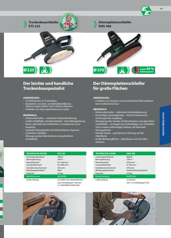 %u00d8225 %u00d8370SCHLEIFEN/FR%u00c4SEN/GL%u00c4TTENTECHNISCHE DATEN EWS 400Leistungsaufnahme 800 WNennspannung 230 V ~Nenndrehzahl 0-85 min-1Leerlaufdrehzahl 0-140 min-1Scheibendurchmesser 370 mmWerkzeugaufnahme Steckverbindung/KlettGewicht 3,9 kgBestellnummer 0620F000Lieferumfang im Kartoninkl. 1x Schleifpapier P24TECHNISCHE DATEN ETS 225Leistungsaufnahme 700 WNennspannung 230 V ~Nenndrehzahl 0-1.450 min-1Leerlaufdrehzahl 0-2.300 min-1Scheibendurchmesser 225 mmWerkzeugaufnahme KlettGewicht 2,9 kgBestellnummer 06203000Lieferumfang im Koffer inkl. Kletthafttellerund Schleifpapier-Startset(1x P60/P80/P100/P220)Der D%u00e4mmplattenschleiferf%u00fcr gro%u00dfe Fl%u00e4chenANWENDUNG:%u2013 Schleifen von Styropor und mineralischen D%u00e4mmplatten beim Vollw%u00e4rmeschutzMERKMALE:%u2013 Elektronikschalter %u2013 stufenlose Drehzahl%u00e4nderung%u2013 Dreistufiges Spezialgetriebe %u2013 hohes Drehmoment, durchzugsstark, langlebig%u2013 Absaugung %u00fcber Haube mit B%u00fcrstenkranz und gelochtem Schleifteller %u2013 verringert das Umherfliegen von Schleifteilchen, erspart aufwendiges S%u00e4ubern der Baustelle%u2013 Absaugstutzen %u2013 Flexible Haube %u2013 geschlossene F%u00fchrung auf der Oberfl%u00e4che%u2013 Gro%u00dfe Werkzeugfl%u00e4che %u2013 planebenes und schnelles ArbeitenD%u00e4mmplattenschleiferEWS 400Der leichte und handlicheTrockenbauspezialistANWENDUNG:%u2013 Schleifarbeiten im Trockenbau %u2013 Bearbeiten von Holz- und Metalloberfl%u00e4chen%u2013 ideal an engen Stellen und in kleinen R%u00e4umen%u2013 Schleifen von Gips, Spachtelmassen, FarbeMERKMALE:%u2013 Elektronikschalter %u2013 stufenlose Drehzahl%u00e4nderung%u2013 Gro%u00dfer Schleifteller, schnelle Drehzahl %u2013 hohe Abtragsleistung%u2013 Motor oberhalb des Schleiftellers in staubarmer Zone %u2013 langlebig%u2013 Spezielle Absaughaube mit abnehmbarem Segment %u2013 randnahes Schleifen%u2013 Absaugung %u00fcber B%u00fcrstenkranz und gelochtem Schleifteller TrockenbauschleiferETS 225mind. 50 %Zeitersparnis101Trockenbauschleifer