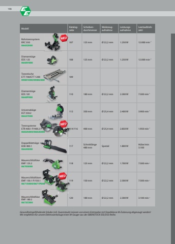 Gesundheitsgef%u00e4hrdende St%u00e4ube (z.B. Quarzstaub) m%u00fcssen von einem Entstauber mit Staubklasse M-Zulassung abgesaugt werden!Wir empfehlen f%u00fcr unsere Elektrowerkzeuge einen M-Sauger aus der EIBENSTOCK ESS/DSS-Reihe.Modell Katalog,seiteScheibendurchmesserWerkzeugaufnahmeLeistungsaufnahmeLeerlaufdrehzahlRohrtrennsystemERC 35006652000107 125 mm %u00d8 22,2 mm 1.250 W 12.000 min-1Diamants%u00e4geEDS 1250660V000108 125 mm %u00d8 22,2 mm 1.250 W 12.000 min-1TrenntischeETT 700/ETT 120009801000/09802000109Diamants%u00e4geEDS 1810660P000110 180 mm %u00d8 22,2 mm 2.300 W 7.500 min-1Universals%u00e4geEST 350.206637000112 350 mm %u00d8 25,4 mm 2.400 W 3.900 min-1TrennsystemeETR 400.1 P/400.2 P0682A000/0682E000114/116 400 mm %u00d8 25,4 mm 2.850 W 1.950 min-1Doppelblatts%u00e4geEDB 480.106644000117 Schnittl%u00e4nge480 mm Spezial 1.800 W H%u00fcbe/min3.100Mauerschlitzfr%u00e4seEMF 125.206703000118 125 mm %u00d8 22,2 mm 1.700 W 7.500 min-1Mauerschlitzfr%u00e4senEMF 150.1 P/150.10671A000/0671P000119 150 mm %u00d8 22,2 mm 2.300 W 7.500 min-1Mauerschlitzfr%u00e4seEMF 180.2 0672C000120 180 mm %u00d8 22,2 mm 2.300 W 3.100 min-1106