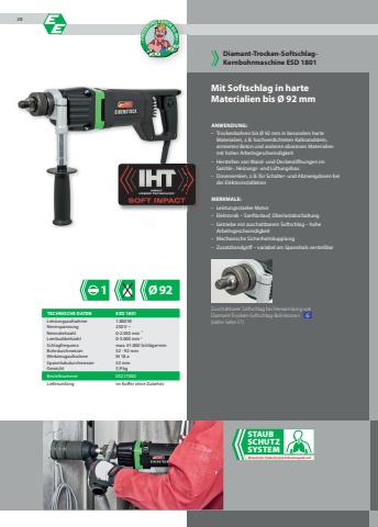 1 %u00d892G TECHNISCHE DATEN ESD 1801Leistungsaufnahme 1.800 WNennspannung 230 V ~Nenndrehzahl 0-2.050 min -1Leerlaufdrehzahl 0-3.000 min-1Schlagfrequenz max. 41.000 Schl%u00e4ge/minBohrdurchmesser 52 - 92 mmWerkzeugaufnahme M 18 aSpannhalsdurchmesser 53 mmGewicht 5,9 kgBestellnummer 03217000Lieferumfang im Koffer ohne Zubeh%u00f6rMit Softschlag in harte Materialien bis %u00d8 92 mmANWENDUNG:%u2013 Trockenbohren bis %u00d8 92 mm in besonders harte Materialien, z.B. hochverdichteten Kalksandstein, armierten Beton und anderen abrasiven Materialien mit hoher Arbeitsgeschwindigkeit%u2013 Herstellen von Wand- und Decken%u00f6ffnungen im Sanit%u00e4r-, Heizungs- und L%u00fcftungsbau%u2013 Dosensenken, z.B. f%u00fcr Schalter- und Abzweigdosen bei der ElektroinstallationMERKMALE:%u2013 Leistungsstarker Motor%u2013 Elektronik %u2013 Sanftanlauf, %u00dcberlastabschaltung%u2013 Getriebe mit zuschaltbarem Softschlag %u2013 hohe Arbeitsgeschwindigkeit%u2013 Mechanische Sicherheitskupplung%u2013 Zusatzhandgriff %u2013 variabel am Spannhals verstellbarDiamant-Trocken-SoftschlagKernbohrmaschine ESD 1801Zuschaltbarer Softschlag bei Verwendung von Diamant-Trocken-Softschlag-Bohrkronen(siehe Seite 57)STAUBSCHUTZSYSTEMMineralische St%u00e4ube k%u00f6nnen krebserzeugend sein!28