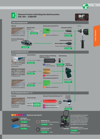 352300003524200035512000355140003561400035612000356150003524100035614000200 mm 36395000450 mm 36391000BACA B C DGE G35450000356520003591000035913000D 200 mm, %u00d8 82 mmE 420 mm, %u00d8 52-82 mm35612000150 mm%u00d8 52 mm-82 mmSch%u00e4rfplatte320 x 320 x 55 mm35876000MIT STAUBABSAUGUNG M 18 - 1%u00bc\MIT STAUBABSAUGUNG HBOHNE STAUBABSAUGUNGDiamant-Trocken-Bohrkronen 1%u00bc\Zentrierstange1%u00bc\Materialf%u00fcr Mauerwerk,KalksandsteinStaubabsaugung HBZentrierspitzefederndDosensenker trocken M 16 M 18 aAufnahmeschaft HM 16 a - M 18 if%u00fcr Mauerwerk, SoftbetonM 16 a - M 18 if%u00fcr KalksandsteinAufnahmeschaft SDSM 16 a - M 18 i inkl. SDS BohrerMaterial%u00d8 68 mm und %u00d8 82 mmZentrierbohrerDosensenker trocken M 16f%u00fcr Mauerwerk, SoftbetonMaterial%u00d8 68 mm und %u00d8 82 mm%u00d8 68 mm und %u00d8 82 mmBohrkronen siehe Seite 60Diamant-Trocken-Softschlag-KernbohrmaschineESD 1801 %u2013 ZUBEH%u00d6RSch%u00e4rfstein200 x 100 x 50 mm Kupferring 1%u00bc\zum leichten L%u00f6sen der Bohrkrone1 St%u00fcckLeichtl%u00f6sering 1%u00bc\f%u00fcr Bohrkronen1 St%u00fcckStaubabsaugungZGesundheitsgef%u00e4hrdende St%u00e4ube (z.B. Quarzstaub) m%u00fcssen von einem Entstauber mit Staubklasse M-Zulassung abgesaugt werden! Wir empfehlen f%u00fcr unsere Elektrowerkzeuge einen M-Sauger aus der EIBENSTOCK ESS/DSS-Reihe.Zentrierspitze, federndf%u00fcr Staubabsaugung H 35240000Nutzl%u00e4nge 70 mmf%u00fcr armierten Beton,KalksandsteinDiamant-Trocken-SoftschlagBohrkronen M 16Zwischenringf%u00fcr %u00d8 52 mmDIAMANT-KERNBOHRENUniversal-AbsaugringUAR 162 G29