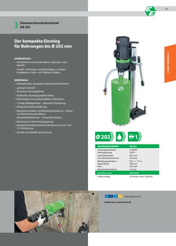 %u00d8202 1H I J QDer kompakte Einstiegf%u00fcr Bohrungen bis %u00d8 202 mmANWENDUNG:%u2013 Nassbohren in armierten Beton, Naturstein und Asphalt%u2013 Sanit%u00e4r-, Heizungs- und L%u00fcftungsbau, sonstige Installateure, Hoch- und Tiefbau, GalabauMERKMALE:%u2013 Platzsparende, kompakte und leichte Bohreinheit%u2013 geringes Gewicht%u2013 Preiswerte Einstiegsklasse%u2013 Kraftvoller, durchzugsstarker Motor%u2013 Bohrst%u00e4nder mit auswechselbarer Zahnleiste%u2013 1-Gang %u00d6lbadgetriebe %u2013 optimale Schmierung%u2013 Integrierte Wasserzuf%u00fchrung%u2013 Maschinenschalter mit %u00dcberlastabschaltung %u2013 Schutz vor %u00dcberlastung des Motors%u2013 Abschaltkohleb%u00fcrsten %u2013 Schutz des Motors%u2013 Mechanische Sicherheitskupplung%u2013 Edelstahl-Kombispindel f%u00fcr Aufnahme von G%u00bd\1%u00bc\%u2013 Antrieb und St%u00e4nder feste EinheitDiamant-KernbohreinheitDB 201TECHNISCHE DATEN DB 201Leistungsaufnahme 2.500 WNennspannung 230 V ~Leerlaufdrehzahl 675 min-1max. Bohrdurchmesser 202 mmWerkzeugaufnahme G%u00bd\S%u00e4ulenl%u00e4nge 790 mmHub 550 mmGewicht Bohreinheit 15,5 kg Bestellnummer 0B33R000Lieferumfang im Karton ohne Zubeh%u00f6rDIAMANT-KERNBOHRENNass-BohrkronenBohrkronen siehe Seite 6047