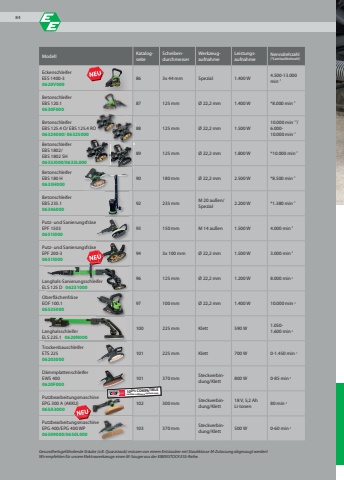 100% COMPATIBLEcordless-alliance-system.comGesundheitsgef%u00e4hrdende St%u00e4ube (z.B. Quarzstaub) m%u00fcssen von einem Entstauber mit Staubklasse M-Zulassung abgesaugt werden!Wir empfehlen f%u00fcr unsere Elektrowerkzeuge einen M-Sauger aus der EIBENSTOCK ESS-Reihe.Modell Katalog,seiteScheibendurchmesserWerkzeugaufnahmeLeistungsaufnahmeNenndrehzahl (*Leerlaufdrehzahl)EckenschleiferEES 1400-30620V00086 3x 44 mm Spezial 1.400 W 4.500-13.000 min-1BetonschleiferEBS 120.10630F00087 125 mm %u00d8 22,2 mm 1.400 W *8.000 min-1BetonschleiferEBS 125.4 O/ EBS 125.4 RO06324000/ 0632500088 125 mm %u00d8 22,2 mm 1.500 W10.000 min-1//6.000-10.000 min-1BetonschleiferEBS 1802/EBS 1802 SH0633J000/0633L00089 125 mm %u00d8 22,2 mm 1.800 W *10.000 min-1BetonschleiferEBS 180 H0633H00090 180 mm %u00d8 22,2 mm 2.500 W *8.500 min-1BetonschleiferEBS 235.10634600092 235 mm M 20 au%u00dfen/Spezial 2.200 W *1.380 min-1Putz- und Sanierungsfr%u00e4seEPF 15030651I00093 150 mm M 14 au%u00dfen 1.500 W 4.000 min-1Putz- und Sanierungsfr%u00e4seEPF 200-30651I00094 3x 100 mm %u00d8 22,2 mm 1.500 W 3.000 min-1Langhals-SanierungsschleiferELS 125 D 0623100096 125 mm %u00d8 22,2 mm 1.200 W 8.000 min-1Oberfl %u00e4chenfr%u00e4seEOF 100.10653500097 100 mm %u00d8 22,2 mm 1.400 W 10.000 min-1LanghalsschleiferELS 225.1 0620N000100 225 mm Klett 590 W 1.050-1.600 min-1TrockenbauschleiferETS 22506203000101 225 mm Klett 700 W 0-1.450 min-1D%u00e4mmplattenschleiferEWS 4000620F000101 370 mm Steckverbin,dung/Klett 800 W 0-85 min-1Putzbearbeitungsmaschine EPG 300 A (AKKU)065A3000102 300 mm Steckverbin,dung/Klett18 V, 5,2 AhLi-Ionen 80 min-1PutzbearbeitungsmaschineEPG 400/EPG 400 WP06509000/0650L000103 370 mm Steckverbin,dung/Klett 500 W 0-60 min-184