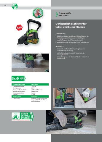 3x %u00d8 44TECHNISCHE DATEN EES 1400-3Leistungsaufnahme 1.400 WNennspannung 230 V ~Nenn- /Leerlaufdrehzahl 4.500-13.000 min-1Scheibendurchmesser 3x %u00d8 44 mmWerkzeugaufnahme SpezialGewicht 3,3 kgBestellnummer 0620V000Lieferumfang im Koffer inkl. Montagewerkzeug, 3x Schleifteller Beton und SchraubenSTAUBSCHUTZSYSTEMMineralische St%u00e4ube k%u00f6nnen krebserzeugend sein!Der handliche Schleifer f%u00fcrEcken und kleine Fl%u00e4chenANWENDUNG:%u2013 Schleifen in Ecken, Winkeln und kleinen Fl%u00e4chen z.B. Fensterlaibungen, Nischen, unter Heizk%u00f6rpern%u2013 Ideal f%u00fcr Treppen- und Fliesensanierungen%u2013 Schleifen bis direkt an die Kante (ohne B%u00fcrstenkranz)MERKMALE:%u2013 Elektronik: Sanftanlauf, Drehzahlregelung und Drehzahlkonstanthaltung%u2013 Leicht, kompakt und handlich - ideal auch f%u00fcr %u00dcberkopfarbeiten%u2013 Staubabsaugung - staubarmes Arbeiten vor allem im InnenbereichEckenschleiferEES 1400-386