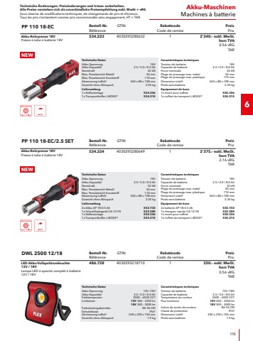 Technische %u00c4nderungen. Preis%u00e4nderungen und Irrtum vorbehalten.Alle Preise verstehen sich als unverbindliche Preisempfehlung exkl. MwSt + vRGSous r%u00e9serve de modifications techniques, de changements de prix et d%u2019erreurs. Tous les prix s%u2018entendent comme prix recommand%u00e9s sans engagement, HT + TAR192Zubeh%u00f6r WinkelschleiferAccessoires Meuleses d%u2018angle Diamantjet %u2013 Diamanttrennscheibe UniversalDiamantjet %u2013 Disque de tron%u00e7onnage diamant%u00e9 universelRabattcodeCode de remise2Universaltrennscheibe f%u00fcr die g%u00e4ngigsten Baustellenmaterialien wie z.B. Beton B45 (hafter Beton), weiche Granite, Klinker, Ziegel.Disque de tron%u00e7onnage universel pour les mat%u00e9riaux de construction les plus courants tels que le b%u00e9ton B45 (b%u00e9ton dur), les granits tendres, le clinker, les briques.BezeichnungD%u00e9signationDurchmesserDiam%u00e8treAufnahme ScheibenLogement disquesBestell-Nr.R%u00e9f%u00e9renceVEUEPreis PrixD-TCS U 230x22.2230 mm22.2500.7201106.%u2013Diamantjet %u2013 Diamanttrennscheibe Standard BetonDiamantjet %u2013 Disque de tron%u00e7onnage diamant%u00e9 universelRabattcodeCode de remise2Schnelle, langlebige Universal-Trennscheibe, geeignet f%u00fcr Beton und Stein.Disque universel rapide et durable, convient pour le b%u00e9ton et la pierre.BezeichnungD%u00e9signationDurchmesserDiam%u00e8treAufnahme ScheibenLogement disquesBestell-Nr.R%u00e9f%u00e9renceVEUEPreis PrixD-TCS S 125x22.2125 mm22.2349.046127.%u2013D-TCS S 230x22.2230 mm22.2349.054160.%u2013Diamantjet %u2013 Diamanttrennscheibe Premium FlieseDiamantjet %u2013 Disque %u00e0 tron%u00e7onner diamant%u00e9 Premium CarrelageRabattcodeCode de remise2Schnelle, langlebige Fliesen-Trennscheibe mit geschlossenem Diamantsegment. Geeignet f%u00fcr Schnitte in alle Fliesen, Marmor, Schiefer sowie Granit und Naturstein. Sehr pr%u00e4zise und ger%u00e4uscharm.Disque %u00e0 d%u00e9couper les carreaux rapide et durable avec segment diamant%u00e9 ferm%u00e9. Convient pour les coupes dans tous les carrelages, le marbre, l%u2018ardoise ainsi que le granit et la pierre naturelle. Tr%u00e8s pr%u00e9cis et silencieux.BezeichnungD%u00e9signationDurchmesserDiam%u00e8treAufnahme ScheibenLogement disquesBestell-Nr.R%u00e9f%u00e9renceVEUEPreis PrixD-TCS P 115x22.2115 mm22.2349.011140.%u2013D-TCS P 125x22.2125 mm22.2349.038143.%u2013D%u00fcnne Trennscheibe (1 mm) f%u00fcr Edelstahl/Stahl Xtreme PlusDisque de tron%u00e7onnage mince (1 mm) pour inox/acier Xtreme PlusRabattcodeCode de remise2Gerade, f%u00fcr schnelles Trennen ohne Kraftaufwand von d%u00fcnnwandigen Rohren, Profilen und Blechen. Reduzierter Schnittdruck und minimale Zerspannung sorgen f%u00fcr einen k%u00fchlen Schnitt, gratarme bis gratfreie Kanten und vermeiden Blauverf%u00e4rbung und reduzieren den Funkenflug. 30% mehr Standzeit durch Verpackung in der Dose mit Frischeversiegelung.Droite, pour un tron%u00e7onnage rapide et sans effort de tubes, profil%u00e9s et t%u00f4les %u00e0 parois fines. Une pression de coupe r%u00e9duite et un serrage minimal assurent une coupe froide, des bords avec peu ou pas de bavures et %u00e9vitent la coloration bleue et r%u00e9duisent les %u00e9tincelles. Dur%u00e9e de vie accrue de 30% gr%u00e2ce %u00e0 l%u2018emballage en bo%u00eete avec scellage fra%u00eecheur.BezeichnungD%u00e9signationDurchmesserDiam%u00e8treAufnahme ScheibenLogement disquesForm ScheibeForme du disqueBestell-Nr.R%u00e9f%u00e9renceVEUEPreis PrixM-CD 125/1 INOX VE10125 mm22.2Gerade / Droit533.3481027.%u2013NEWTrennscheiben / Disques %u00e0 tron%u00e7onnerDiamant-Trennscheibe KeramikDisque diamant%u00e9 ceramiqueRabattcodeCode de remise4Diamant-Trennscheibe mit geschlossenen Segmenten zur Bearbeitung von Keramik, Fliessen, Feinsteinzeug, d%u00fcnne Granite und Verbundglas.Disque diamant%u00e9 avec segments ferm%u00e9s pour l%u2018usinage de la c%u00e9ramique, des carreaux, du gr%u00e8s c%u00e9rame, des granits minces et du verre feuillet%u00e9.BezeichnungD%u00e9signationDurchmesserDiam%u00e8treAufnahme ScheibenLogement disquesBestell-Nr.R%u00e9f%u00e9renceVEUEPreis PrixFSZ-PLUS %u00f8115115 mm22.275.545160.%u2013FSZ-PLUS %u00f8125125 mm22.275.546166.%u2013