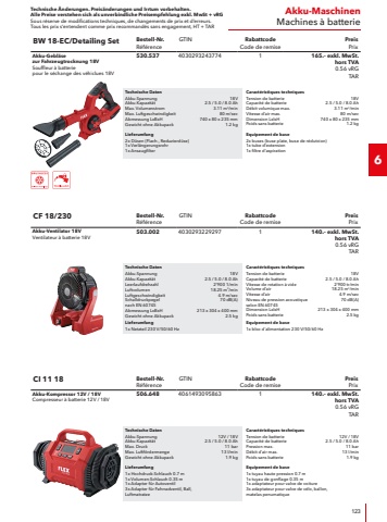 Technische %u00c4nderungen. Preis%u00e4nderungen und Irrtum vorbehalten.Alle Preise verstehen sich als unverbindliche Preisempfehlung exkl. MwSt + vRGSous r%u00e9serve de modifications techniques, de changements de prix et d%u2019erreurs. Tous les prix s%u2018entendent comme prix recommand%u00e9s sans engagement, HT + TAR274Metalloberfl%u00e4chen-BearbeitungTraitement de surface m%u00e9talliqueTechnische DatenLeistungsaufnahme800 WLeistungsabgabe425 WSpannung230 VFrequenz50/60 HzBandgeschwindigkeit3 %u2013 8 m/secLeerlaufdrehzahl1%u2018400 %u2013 4%u2018000 1/minBandl%u00e4nge533 mmBandbreite4 / 9 / 30 mmGeeignetf%u00fcrmax.Rohrdurchmesser50 mmKabell%u00e4nge4.0 mAbmessung LxBxH320 x 210 x 195 mmGewicht2.7 kgLieferumfang1x Schleifvorsatz Rohrband459.5851x Schleifvorsatz Bandfeile459.5931x Wechselrollensatz459.6072x Schleifband ZIRCOFLEX303.6152x Schleifband ZIRCOFLEX303.6232x Schleifband ZIRCOFLEX257.1052x Schleifband ZIRCOFLEX257.1022x Schleifband ZIRCOFLEX255.3282x Schleifband ZIRCOFLEX255.3291x Schleifband MESHFLEX318.6631x Schleifband MESHFLEX318.6471x Seitlicher Handgriff, rot194.0341x Innensechskantschl%u00fcssel, SW 4102.2291x Innensechskantschl%u00fcssel, SW 5115.4601x Innensechskantschl%u00fcssel, SW 6104.1671x Koffereinlage457.3371x Transportkoffer L-BOXX%u00ae414.085Caract%u00e9ristiques techniquesPuissance absorb%u00e9e800 WPuissance utile425 WTension230 VFr%u00e9quence50/60 HzVitesse de bande3 %u2013 8 m/secVitesse de rotation %u00e0 vide1%u2018400 %u2013 4%u2018000 tr/minLongueur de bande533 mmLargeur de bande4 / 9 / 30 mmPour diam%u00e8tre de tube max.50 mmLongueur de c%u00e2ble4.0 mDimension LxlxH320 x 210 x 195 mmPoids2.7 kgEquipement de base1x adaptateurdepon%u00e7age%u00e0bandepourtubes457.5851x adaptateur de pon%u00e7age lime %u00e0 bande459.5931x jeu de roulettes interchangeables459.6072x bande abrasive ZIRCOFLEX303.6152x bande abrasive ZIRCOFLEX303.6232x bande abrasive ZIRCOFLEX257.1052x bande abrasive ZIRCOFLEX257.1022x bande abrasive ZIRCOFLEX255.3282x bande abrasive ZIRCOFLEX255.3291x bande abrasvie MESHFLEX318.6631x bande abrasive MESHFLEX318.6471x poign%u00e9e lat%u00e9rale, rouge194.0341x cl%u00e9 hex, SW 4102.2291x cl%u00e9 hex, SW 5115.4601x cl%u00e9 hex, SW 6104.1671x insert pour coffret457.3371x coffret de transport L-BOXX%u00ae414.085BRE 8-4 9 INOX SetBestell-Nr.R%u00e9f%u00e9renceGTINRabattcodeCode de remisePreisPrixRohrbandschleifer und BandfeileTRINOXFLEX im SetPonceuse %u00e0 bande pour tubes et limeTRINOXFLEX en set453.463403029320108811%u2018225.%u2013 exkl. MwSt. hors TVA 0.56 vRGTARTechnische DatenLeistungsaufnahme800 WLeistungsabgabe425 WSpannung230 VFrequenz50/60 HzBandgeschwindigkeit3 %u2013 8 m/secLeerlaufdrehzahl1%u2018400 %u2013 4%u2018000 1/minBandl%u00e4nge533 mmBandbreite4 / 9 / 30 mmKabell%u00e4nge4.0 mAbmessung LxBxH320 x 210 x 195 mmGewicht2.6 kgLieferumfang1x Schleifvorsatz Bandfeile459.5932x Schleifband ZIRCOFLEX303.6152x Schleifband ZIRCOFLEX303.6232x Schleifband ZIRCOFLEX257.1052x Schleifband ZIRCOFLEX257.1022x Schleifband ZIRCOFLEX255.3282x Schleifband ZIRCOFLEX255.3291x Schleifband MESHFLEX318.6631x Schleifband MESHFLEX318.6471x Seitlicher Handgriff, rot194.0341x Innensechskantschl%u00fcssel, SW 5115.4601x Koffereinlage457.3371x Transportkoffer L-BOXX%u00ae414.085Caract%u00e9ristiques techniquesPuissance absorb%u00e9e800 WPuissance utile425 WTension230 VFr%u00e9quence50/60 HzVitesse de bande3 %u2013 8 m/secVitesse de rotation %u00e0 vide1%u2018400 %u2013 4%u2018000 tr/minLongueur de bande533 mmLargeur de bande4 / 9 / 30 mmLongueur de c%u00e2ble4.0 mDimension LxlxH320 x 210 x 195 mmPoids2.7 kgEquipement de base1x adaptateur de pon%u00e7age lime %u00e0 bande459.5932x bande abrasive ZIRCOFLEX303.6152x bande abrasive ZIRCOFLEX303.6232x bande abrasive ZIRCOFLEX257.1052x bande abrasive ZIRCOFLEX257.1022x bande abrasive ZIRCOFLEX255.3282x bande abrasive ZIRCOFLEX255.3291x bande abrasvie MESHFLEX318.6631x bande abrasive MESHFLEX318.6471x poign%u00e9e lat%u00e9rale, rouge194.0341x cl%u00e9 hex, SW 5115.4601x insert pour coffret457.3371x coffret de transport L-BOXX%u00ae414.085FBE 8-4 140Bestell-Nr.R%u00e9f%u00e9renceGTINRabattcodeCode de remisePreisPrixBandfeile TRINOXFLEXPonceuse %u00e0 bande TRINOXFLEX453.45540302932010711685.%u2013 exkl. MwSt. hors TVA 0.56 vRGTAR