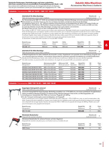 Technische %u00c4nderungen. Preis%u00e4nderungen und Irrtum vorbehalten.Alle Preise verstehen sich als unverbindliche Preisempfehlung exkl. MwSt + vRGSous r%u00e9serve de modifications techniques, de changements de prix et d%u2019erreurs. Tous les prix s%u2018entendent comme prix recommand%u00e9s sans engagement, HT + TAR455S%u00e4genSciesTechnische DatenLeistungsaufnahme850 WLeistungsabgabe850 WSpannung230 VFrequenz50/60 HzS%u00e4gebandl%u00e4nge1335 mmS%u00e4gebandbreite13 mmS%u00e4gebanddicke0.65 mmWinkelverstellung45%u00b0Schnittl%u00e4nge 90%u00b0100 mmSchnittbreite 90%u00b080 mmSchnittl%u00e4nge 45%u00b068 mmSchnittbreite 45%u00b055 mmKabell%u00e4nge4.0 mAbmessung LxBxH640 x 310 x 390 mmGewicht S%u00e4geb%u00fcgel7.9 kgGewicht18 kgLieferumfang1x Parallelanschlag385.2471x Bimetall-S%u00e4gebandCaract%u00e9ristiques techniquesPuissance absorb%u00e9e850 WPuissance utile850 WTension230 VFr%u00e9quence50/60 HzLongueur du ruban de scie1335 mmLargeur du ruban de scie13 mm%u00c9paisseur de ruban de scie0.65 mmR%u00e9glage angulaire45%u00b0Longueur de coupe 90%u00b0100 mmLargeur de coupe 90%u00b080 mmLongueur de coupe 45%u00b068 mmLargeur de coupe 45%u00b055 mmLongueur de c%u00e2ble4.0 mDimension LxlxH640 x 310 x 390 mmPoids archet de scie7.9 kgPoids18 kgEquipement de base1x but%u00e9e parall%u00e8le385.2471x ruban de scie bim%u00e9talliqueSBG 4910Bestell-Nr.R%u00e9f%u00e9renceGTINRabattcodeCode de remisePreisPrixMetall-Bands%u00e4ge mit schwenkbarem S%u00e4gerahmenScie %u00e0 ruban m%u00e9tallique avec b%u00e2ti pivotant390.51840302931631951625.%u2013 exkl. MwSt. hors TVA 5.56 vRGTARTechnische DatenLeistungsaufnahme1400 WLeistungsabgabe720 WSpannung230 VFrequenz50/60 HzMax. Leerlaufdrehzahl3%u2018800 1/minSchnitttiefe0 %u2013 63 mmS%u00e4geblattdurchmesser185 mmS%u00e4geblattbohrung20 mmMax. Materialst%u00e4rke in Alu 250 N/mm26 mmMax. Materialst%u00e4rke inStahl 400 N/ mm210 mmKabell%u00e4nge4.0 mGewicht5.4 kgLieferumfang2x HM-S%u00e4geblatt f%u00fcr Stahl312.3041x Parallelanschlag312.3121x Ring-/Gabelschl%u00fcssel312.3471x Schutzbrille1x TransportkofferCaract%u00e9ristiques techniquesPuissance absorb%u00e9e1400 WPuissance utile720 WTension230 VFr%u00e9quence50/60 HzVitesse de rotation %u00e0 vide max.3%u2018800 tr/minProfondeur de coupe0 %u2013 63 mmDiam%u00e8tre de lame de scie185 mmAl%u00e8sage de lame de scie20 mm%u00c9paisseur de mat%u00e8riau max. dansl%u2018aluminium 250 N/mm26 mm%u00c9paisseur de mat%u00e8riau max. dansl%u2018acier 400 N/mm210 mmLongueur de c%u00e2ble4.0 mPoids5.4 kgEquipement de base2x lames carbure pour l%u2018acier312.3041x but%u00e9e parall%u00e8le312.3121x cl%u00e9 mixte312.3471x lunettes de protection1x coffret de transportCSM 4060Bestell-Nr.R%u00e9f%u00e9renceGTINRabattcodeCode de remisePreisPrixMetall-Handkreiss%u00e4ge f%u00fcr den TrockenschnittScie circulaire %u00e0 m%u00e9taux %u00e0 lame carbure307.81540302931130841685.%u2013 exkl. MwSt. hors TVA 2.31 vRGTAR