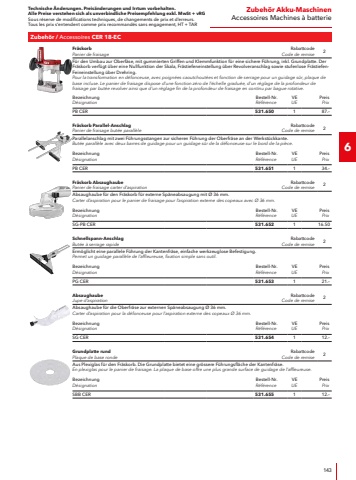 Technische %u00c4nderungen. Preis%u00e4nderungen und Irrtum vorbehalten.Alle Preise verstehen sich als unverbindliche Preisempfehlung exkl. MwSt + vRGSous r%u00e9serve de modifications techniques, de changements de prix et d%u2019erreurs. Tous les prix s%u2018entendent comme prix recommand%u00e9s sans engagement, HT + TAR475Zubeh%u00f6r S%u00e4genAccessoires SciesS%u00e4bels%u00e4gebl%u00e4tter f%u00fcr DemontageLames de scie-sabre pour d%u00e9ment%u00e9lementRabattcodeCode de remise12Demontageblatt f%u00fcr winkelgenaue Schnitte bis 180 mm in Hartholz, MDF, Holz mit N%u00e4geln, f%u00fcr Altbausanierung/Fensterrahmen, faserverst%u00e4rkte Kunststoffe/Epoxy.Lame de d%u00e9ment%u00e9lement pour des coupes angulaires pr%u00e9cises jusqu%u2019%u00e0 180 mm dans le bois dur, le MDF, le bois clout%u00e9, pour la r%u00e9novation de b%u00e2timents anciens/les ch%u00e2ssis de fen%u00eatre, les plastiques renforc%u00e9s par des fibres/l%u2019%u00e9poxy.BezeichnungD%u00e9signationZ%u00e4hne pro ZollDents par pouceL%u00e4ngeLongueurBestell-Nr.R%u00e9f%u00e9renceVEUEPreis PrixRS/BI-230 6 VE56\230 mm462.136540.%u2013S%u00e4bels%u00e4gebl%u00e4tter f%u00fcr D%u00e4mmstoffLames de scie-sabre pour isolantRabattcodeCode de remise12S%u00e4bels%u00e4geblatt f%u00fcr Schnitte in D%u00e4mmstoffe, Mineralwolle, Schaum, Styropor, Styrodur, Leder, Gummi, Papier, Pappe und Teppich.Lame de scie sabre pour des coupes dans du materiel isolant, laine min%u00e9rale, mousse, polystyr%u00e8ne (Styropor, Styrodur), cuir, caouthouc, papier, carton et moquette.BezeichnungD%u00e9signationL%u00e4ngeLongueurBestell-Nr.R%u00e9f%u00e9renceVEUEPreis PrixRS/CV-300 W VE2300 mm462.144240.%u2013S%u00e4bels%u00e4gebl%u00e4tter f%u00fcr HolzLames de scie-sabre pour boisRabattcodeCode de remise12S%u00e4bels%u00e4geblatt f%u00fcr sehr saubere Schnitte von 6-150 mm in Sperrholz, Multiplex/Tischlerplatten, MDF, beschichtete Platten.Lame de scie-sabre pour des coupes bien nettes de 6 %u00e0 150 mm dans le contreplaqu%u00e9, les panneaux de contreplaqu%u00e9 multiplis/panneaux latt%u00e9s, le MDF, les panneaux rev%u00eatus.BezeichnungD%u00e9signationZ%u00e4hne pro ZollDents par pouceL%u00e4ngeLongueurBestell-Nr.R%u00e9f%u00e9renceVEUEPreis PrixRS/CV-230 10 VE210\230 mm462.152244.%u2013S%u00e4bels%u00e4gebl%u00e4tter f%u00fcr PalettenLames de scie-sabre pour palettesRabattcodeCode de remise12S%u00e4bels%u00e4geblatt f%u00fcr Schnitte von 30-100 mm f%u00fcr den Palettenbau.Lame de scie-sabre pour des coupes bien nettes de 6 %u00e0 150 mm dans le contreplaqu%u00e9, les panneaux de contreplaqu%u00e9 multiplis/panneaux latt%u00e9s, le MDF, les panneaux rev%u00eatus.BezeichnungD%u00e9signationZ%u00e4hne pro ZollDents par pouceL%u00e4ngeLongueurBestell-Nr.R%u00e9f%u00e9renceVEUEPreis PrixRS/BI-230 10 VE510\230 mm462.160527.%u2013S%u00e4bels%u00e4geblatt-Sortiment f%u00fcr Kunststoff/Holz/MetallAssortiment de lames de scie sabre pour PVC/Bois/M%u00e9tauxRabattcodeCode de remise12Sortiment bestehend aus: 1 S%u00e4bels%u00e4geblatt f%u00fcr Schnitte von 1,5-3 mm in rostfreien Stahl, Metall/Stahl, Stahlbleche, Stahlrohre, offene/geschlossene Profile. 1 S%u00e4bels%u00e4geblatt f%u00fcr Schnitte von 6-100 mm in MDF, Holz mit N%u00e4geln, f%u00fcr Altbausanierung/Fensterrahmen, Metall/Stahl, faserverst%u00e4rkte Kunststoffe/Epoxy, Kurvenschnitte. 1 S%u00e4bels%u00e4geblatt f%u00fcr Schnitte von 3-190 mm in Holz mit N%u00e4geln, Palettenbau, faserverst%u00e4rkte Kunststoffe/Epoxy, sowie f%u00fcr Schnitte von 3-12 mm in Metall/Stahl, Stahlrohre.Assortiment comprenant : 1 lame de scie-sabre pour des coupes de 1,5 %u00e0 3 mm dans l%u2019acier inoxydable, le m%u00e9tal/l%u2019acier, les t%u00f4les d%u2019acier, les tubes d%u2019acier, les profil%u00e9s ouverts/ferm%u00e9s. 1 lame de scie-sabre pour des coupes de 6 %u00e0 100 mm dans le MDF, le bois clout%u00e9, pour la r%u00e9novation de b%u00e2timents anciens/les ch%u00e2ssis de fen%u00eatre, le m%u00e9tal/l%u2019acier, les plastiques renforc%u00e9s par des fibres/l%u2019%u00e9poxy, les coupes curvilignes. 1 lame de scie-sabre pour des coupes de 3 %u00e0 190 mm dans le bois clout%u00e9, le bois de palette, les plastiques renforc%u00e9s par des fibres/l%u2019%u00e9poxy, ainsi que pour des coupes de 3 %u00e0 12 mm dans le m%u00e9tal/l%u2019acier, les tubes d%u2019acier.BezeichnungD%u00e9signationBestell-Nr.R%u00e9f%u00e9renceVEUEPreis PrixRS/BI Set VE3462.179315.%u2013