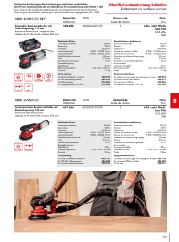 Technische %u00c4nderungen. Preis%u00e4nderungen und Irrtum vorbehalten.Alle Preise verstehen sich als unverbindliche Preisempfehlung exkl. MwSt + vRGSous r%u00e9serve de modifications techniques, de changements de prix et d%u2019erreurs. Tous les prix s%u2018entendent comme prix recommand%u00e9s sans engagement, HT + TAR132WinkelschleiferMeuleses d%u2018angleTechnische DatenLeistungsaufnahme1700 WLeistungsabgabe1050 WSpannung230 VFrequenz50/60 HzMax. Scheibendurchmesser125 mmLeerlaufdrehzahl11%u2018500 1/minWerkzeugaufnahmeM14Kabell%u00e4nge4.0 mAbmessung LxBxH340 x 77 x 105 mmGewicht2.6 kgLieferumfang1x Schutzhaube Schleifen436.8601x SoftVib-Handgriff530.9031x Spannflansch335.2821x Spannmutter M14100.080Caract%u00e9ristiques techniquesPuissance absorb%u00e9e1700 WPuissance utile1050 WTension230 VFr%u00e9quence50/60 HzDiam%u00e8tre de disque max.125 mmVitesse de rotation %u00e0 vide11%u2018500 tr/minEmmanchementM14Longueur de c%u00e2ble4.0 mDimension LxlxH340 x 77 x 105 mmPoids2.6 kgEquipement de base1x carter de protection du pon%u00e7age436.8601x poign%u00e9e SoftVib530.9031x bride de serrage335.2821x ecrou de serrage M14100.080LB 17-11 125Bestell-Nr.R%u00e9f%u00e9renceGTINRabattcodeCode de remisePreisPrix1700 Watt Winkelschleifer mitBremse, 125 mmMeuleuse d%u2018angle 1700 Watt avecfrein, 125 mm447.62540302931972681285.%u2013 exkl. MwSt. hors TVA 0.56 vRGTARTechnische DatenLeistungsaufnahme1700 WLeistungsabgabe1050 WSpannung230 VFrequenz50/60 HzMax. Scheibendurchmesser125 mmLeerlaufdrehzahl2%u2018800 %u201311%u2018500 1/minWerkzeugaufnahmeM14Kabell%u00e4nge4.0 mAbmessung LxBxH340 x 77 x 105 mmGewicht2.6 kgLieferumfang1x Schutzhaube Schleifen436.8601x SoftVib-Handgriff530.9031x Spannflansch335.2821x Spannmutter M14100.080Caract%u00e9ristiques techniquesPuissance absorb%u00e9e1700 WPuissance utile1050 WTension230 VFr%u00e9quence50/60 HzDiam%u00e8tre de disque max.125 mmVitesse de rotation %u00e0 vide2%u2018800 %u2013 11%u2018500 tr/minEmmanchementM14Longueur de c%u00e2ble4.0 mDimension LxlxH340 x 77 x 105 mmPoids2.6 kgEquipement de base1x carter de protection du pon%u00e7age436.8601x poign%u00e9e SoftVib530.9031x bride de serrage335.2821x ecrou de serrage M14100.080LBE 17-11 125Bestell-Nr.R%u00e9f%u00e9renceGTINRabattcodeCode de remisePreisPrix1700 Watt Winkelschleifer mit variablerDrehzahl und Bremse, 125 mmMeuleuse d%u2018angle 1700 Watt %u00e0 vitessede rotation variable et frein, 125 mm447.66840302931972821310.%u2013 exkl. MwSt. hors TVA 0.56 vRGTAR