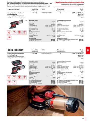 Technische %u00c4nderungen. Preis%u00e4nderungen und Irrtum vorbehalten.Alle Preise verstehen sich als unverbindliche Preisempfehlung exkl. MwSt + vRGSous r%u00e9serve de modifications techniques, de changements de prix et d%u2019erreurs. Tous les prix s%u2018entendent comme prix recommand%u00e9s sans engagement, HT + TAR172Zubeh%u00f6r WinkelschleiferAccessoires Meuleses d%u2018angle StaubschutzkappeCapuchon anti-poussi%u00e8reRabattcodeCode de remise2Perfekter Staubschutz durch aufsteckbare Staubschutzkappen f%u00fcr Winkelschleifer. Das f%u00fchrt zu einer deutlichen Reduktion von Schleifsp%u00e4nen im Innern der Maschine. Ideal f%u00fcr Schleifarbeiten mit keramischen F%u00e4cherschleifscheiben oder Fiberscheiben.Protection parfaite contre la poussi%u00e8re gr%u00e2ce aux capuchons anti-poussi%u00e8re embo%u00eetables pour meuleuses d%u2018angle. Cela permet de r%u00e9duire consid%u00e9rablement les copeaux de pon%u00e7age %u00e0 l%u2018int%u00e9rieur de la machine. Id%u00e9al pour les travaux de pon%u00e7age avec des disques %u00e0 lamelles en c%u00e9ramique ou des disques en fibre.BezeichnungD%u00e9signationF%u00fcr SchutzhaubePour capot de protectionBestell-Nr.R%u00e9f%u00e9renceVEUEPreis PrixST-K SAG%u2022L 1400%u2022L 12-11 125%u2022L 15-11 125%u2022LE 15-11 125%u2022LB 17-11 125%u2022LBE 17-11 125520.543112.%u2013StaubschutzkappeCapuchon anti-poussi%u00e8reRabattcodeCode de remise2Perfekter Staubschutz durch aufsteckbare Staubschutzkappen f%u00fcr Schleifer.Das f%u00fchrt zu einer deutlichen Reduktion von Schleifsp%u00e4nen im Innern der Maschine. Ideal f%u00fcr Schleifarbeiten mit keramischen F%u00e4cherschleifscheiben oder Fiberscheiben..Une protection parfaite contre la poussi%u00e8re gr%u00e2ce %u00e0 des capuchons anti-poussi%u00e8re embo%u00eetables pour les ponceuses. Il en r%u00e9sulte une nette r%u00e9duction des copeaux de pon%u00e7age %u00e0 l%u2018int%u00e9rieur de la machine. Id%u00e9al pour les travaux de pon%u00e7age avec des disques %u00e0 lamelles en c%u00e9ramique ou des disques en fibre.BezeichnungD%u00e9signationF%u00fcr SchutzhaubePour capot de protectionBestell-Nr.R%u00e9f%u00e9renceVEUEPreis PrixST-K INOX%u2022BBE 14-3 110%u2022BBE 14-3 110 Set%u2022BRE 8-4 INOX Set%u2022BRE 14-3 125 Set%u2022BSE 14-3 100%u2022BSE 14-3 100 Set%u2022BSE 14-3 INOX Set%u2022LE 14-7 INOX%u2022SE 14-2 125 Set520.527112.%u2013Absaughauben / Capots d%u2018aspirationAbsaughaubeJupe d%u2018aspirationRabattcodeCode de remise2Absaughauben-Set f%u00fcr Arbeiten mit Trennscheiben f%u00fcr Winkelschleifer 125 mm. Bestehend aus Absaugung und Aluminiumdeckel. Werkzeuglos auf bestehende Schutzhaube montierbar.Kit de hottes d%u2018aspiration pour travaux avec disques %u00e0 tron%u00e7onner pour meuleuses d%u2018angle 125 mm. Compos%u00e9 d%u2018une hotte d%u2018aspiration et d%u2018un couvercle couvercle en aluminium. Peut %u00eatre mont%u00e9 sans outil sur un capot de protection existant.BezeichnungD%u00e9signationDurchmesserDiam%u00e8treBestell-Nr.R%u00e9f%u00e9renceVEUEPreis PrixDE AG D125 Set125 mm530.589195.%u2013AbsaughaubeJupe d%u2018aspirationRabattcodeCode de remise2Absaughauben-Set f%u00fcr Arbeiten mit Trennscheiben f%u00fcr Winkelschleifer 125 mm. Bestehend aus Absaugung und Aluminiumdeckel. Werkzeuglos auf bestehende Schutzhaube montierbar.Kit de hottes d%u2018aspiration pour travaux avec disques %u00e0 tron%u00e7onner pour meuleuses d%u2018angle 125 mm. Compos%u00e9 d%u2018une hotte d%u2018aspiration et d%u2018un couvercle couvercle en aluminium. Peut %u00eatre mont%u00e9 sans outil sur un capot de protection existant.BezeichnungD%u00e9signationDurchmesserDiam%u00e8treBestell-Nr.R%u00e9f%u00e9renceVEUEPreis PrixDE AG D230 Set230 mm530.5901143.%u2013