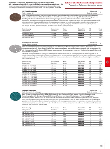 Technische %u00c4nderungen. Preis%u00e4nderungen und Irrtum vorbehalten.Alle Preise verstehen sich als unverbindliche Preisempfehlung exkl. MwSt + vRGSous r%u00e9serve de modifications techniques, de changements de prix et d%u2019erreurs. Tous les prix s%u2018entendent comme prix recommand%u00e9s sans engagement, HT + TAR192Zubeh%u00f6r WinkelschleiferAccessoires Meuleses d%u2018angle Diamantjet %u2013 Diamanttrennscheibe UniversalDiamantjet %u2013 Disque de tron%u00e7onnage diamant%u00e9 universelRabattcodeCode de remise2Universaltrennscheibe f%u00fcr die g%u00e4ngigsten Baustellenmaterialien wie z.B. Beton B45 (hafter Beton), weiche Granite, Klinker, Ziegel.Disque de tron%u00e7onnage universel pour les mat%u00e9riaux de construction les plus courants tels que le b%u00e9ton B45 (b%u00e9ton dur), les granits tendres, le clinker, les briques.BezeichnungD%u00e9signationDurchmesserDiam%u00e8treAufnahme ScheibenLogement disquesBestell-Nr.R%u00e9f%u00e9renceVEUEPreis PrixD-TCS U 230x22.2230 mm22.2500.7201106.%u2013Diamantjet %u2013 Diamanttrennscheibe Standard BetonDiamantjet %u2013 Disque de tron%u00e7onnage diamant%u00e9 universelRabattcodeCode de remise2Schnelle, langlebige Universal-Trennscheibe, geeignet f%u00fcr Beton und Stein.Disque universel rapide et durable, convient pour le b%u00e9ton et la pierre.BezeichnungD%u00e9signationDurchmesserDiam%u00e8treAufnahme ScheibenLogement disquesBestell-Nr.R%u00e9f%u00e9renceVEUEPreis PrixD-TCS S 125x22.2125 mm22.2349.046127.%u2013D-TCS S 230x22.2230 mm22.2349.054160.%u2013Diamantjet %u2013 Diamanttrennscheibe Premium FlieseDiamantjet %u2013 Disque %u00e0 tron%u00e7onner diamant%u00e9 Premium CarrelageRabattcodeCode de remise2Schnelle, langlebige Fliesen-Trennscheibe mit geschlossenem Diamantsegment. Geeignet f%u00fcr Schnitte in alle Fliesen, Marmor, Schiefer sowie Granit und Naturstein. Sehr pr%u00e4zise und ger%u00e4uscharm.Disque %u00e0 d%u00e9couper les carreaux rapide et durable avec segment diamant%u00e9 ferm%u00e9. Convient pour les coupes dans tous les carrelages, le marbre, l%u2018ardoise ainsi que le granit et la pierre naturelle. Tr%u00e8s pr%u00e9cis et silencieux.BezeichnungD%u00e9signationDurchmesserDiam%u00e8treAufnahme ScheibenLogement disquesBestell-Nr.R%u00e9f%u00e9renceVEUEPreis PrixD-TCS P 115x22.2115 mm22.2349.011140.%u2013D-TCS P 125x22.2125 mm22.2349.038143.%u2013D%u00fcnne Trennscheibe (1 mm) f%u00fcr Edelstahl/Stahl Xtreme PlusDisque de tron%u00e7onnage mince (1 mm) pour inox/acier Xtreme PlusRabattcodeCode de remise2Gerade, f%u00fcr schnelles Trennen ohne Kraftaufwand von d%u00fcnnwandigen Rohren, Profilen und Blechen. Reduzierter Schnittdruck und minimale Zerspannung sorgen f%u00fcr einen k%u00fchlen Schnitt, gratarme bis gratfreie Kanten und vermeiden Blauverf%u00e4rbung und reduzieren den Funkenflug. 30% mehr Standzeit durch Verpackung in der Dose mit Frischeversiegelung.Droite, pour un tron%u00e7onnage rapide et sans effort de tubes, profil%u00e9s et t%u00f4les %u00e0 parois fines. Une pression de coupe r%u00e9duite et un serrage minimal assurent une coupe froide, des bords avec peu ou pas de bavures et %u00e9vitent la coloration bleue et r%u00e9duisent les %u00e9tincelles. Dur%u00e9e de vie accrue de 30% gr%u00e2ce %u00e0 l%u2018emballage en bo%u00eete avec scellage fra%u00eecheur.BezeichnungD%u00e9signationDurchmesserDiam%u00e8treAufnahme ScheibenLogement disquesForm ScheibeForme du disqueBestell-Nr.R%u00e9f%u00e9renceVEUEPreis PrixM-CD 125/1 INOX VE10125 mm22.2Gerade / Droit533.3481027.%u2013NEWTrennscheiben / Disques %u00e0 tron%u00e7onnerDiamant-Trennscheibe KeramikDisque diamant%u00e9 ceramiqueRabattcodeCode de remise4Diamant-Trennscheibe mit geschlossenen Segmenten zur Bearbeitung von Keramik, Fliessen, Feinsteinzeug, d%u00fcnne Granite und Verbundglas.Disque diamant%u00e9 avec segments ferm%u00e9s pour l%u2018usinage de la c%u00e9ramique, des carreaux, du gr%u00e8s c%u00e9rame, des granits minces et du verre feuillet%u00e9.BezeichnungD%u00e9signationDurchmesserDiam%u00e8treAufnahme ScheibenLogement disquesBestell-Nr.R%u00e9f%u00e9renceVEUEPreis PrixFSZ-PLUS %u00f8115115 mm22.275.545160.%u2013FSZ-PLUS %u00f8125125 mm22.275.546166.%u2013
