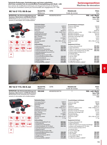 Technische %u00c4nderungen. Preis%u00e4nderungen und Irrtum vorbehalten.Alle Preise verstehen sich als unverbindliche Preisempfehlung exkl. MwSt + vRGSous r%u00e9serve de modifications techniques, de changements de prix et d%u2019erreurs. Tous les prix s%u2018entendent comme prix recommand%u00e9s sans engagement, HT + TAR294Metalloberfl%u00e4chen-BearbeitungTraitement de surface m%u00e9talliqueTechnische DatenLeistungsaufnahme1400 WLeistungsabgabe880 WSpannung230 VFrequenz50/60 HzB%u00fcrsten-/Walzendurchmesser Max.125 mmB%u00fcrsten-/Walzenbreite Max.100 mmLeerlaufdrehzahl1%u2018000 %u2013 3%u2018500 1/minWerkzeugaufnahme19 mmKabell%u00e4nge4.0 mAbmessung LxBxH320 x 210 x 195 mmGewicht2.9 kgLieferumfang1x Schleifvorsatz Satinieren433.4621x Gummiluftwalze433.8961x Luftpumpe256.2841x Schleif-Vlies256.9751x Superfinishing-H%u00fclse436.4291x Superfinishing-H%u00fclse436.4371x Schleifh%u00fclse MESHFLEX434.6123x Schleifh%u00fclse ZIRCOFLEX434.5153x Schleifh%u00fclse ZIRCOFLEX434.5233x Schleifh%u00fclse CORUFLEX434.5741x Koffereinlage433.9181x Transportkoffer L-BOXX%u00ae414.093Caract%u00e9ristiques techniquesPuissance absorb%u00e9e1400 WPuissance utile880 WTension230 VFr%u00e9quence50/60 HzDiam%u00e8tre de brosse125 mmLargeur de brosse100 mmVitesse de rotation %u00e0 vide1%u2018000 %u2013 3%u2018500 tr/minEmmanchement19 mmLongueur de c%u00e2ble4.0 mDimension LxlxH320 x 210 x 195 mmPoids2.9 kgEquipement de base1x adaptateur de pon%u00e7age pour satinage433.4621x cylindre %u00e0 air en caoutchouc433.8961x pompe d%u2018air256.2841x toile abrasive256.9751x manchon abrasif pour polir436.4291x manchon abrasif pour polir436.4371x manchon abrasif MESHFLEX434.6123x manchon abrasif ZIRCOFLEX434.5153x manchon abrasif ZIRCOFLEX434.5233x manchon abrasif CORUFLEX434.5741x insert pour coffret433.9181x coffret de transport L-BOXX%u00ae414.093BSE 14-3 100 SetBestell-Nr.R%u00e9f%u00e9renceGTINRabattcodeCode de remisePreisPrixSatiniermaschine TRINOXFLEX im SetSatineuse TRINOXFLEX en set433.43840302931871841970.%u2013 exkl. MwSt. hors TVA 0.56 vRGTARTechnische DatenLeistungsaufnahme1400 WLeistungsabgabe880 WSpannung230 VFrequenz50/60 HzBandgeschwindigkeit3.5 %u2013 10 m/secLeerlaufdrehzahl1%u2018000 %u2013 3%u2018500 1/minBandl%u00e4nge760 mmBandbreite40 mmGeeignet f%u00fcr max. Rohrdurchmesser125 mmKabell%u00e4nge4.0 mAbmessung LxBxH520 x 160 x 220 mmGewicht3.6 kgLieferumfang1x Schleifvorsatz Rohrband433.4701x Superfinishing-Band326.9171x Superfinishing-Band326.9331x Schleifband MESHFLEX326.8791x Schleifband MESHFLEX326.8525x Schleifband CORUFLEX326.7395x Schleifband CORUFLEX326.7555x Schleifband CORUFLEX434.9141x Koffereinlage433.9181x Transportkoffer L-BOXX%u00ae414.093Caract%u00e9ristiques techniquesPuissance absorb%u00e9e1400 WPuissance utile880 WTension230 VFr%u00e9quence50/60 HzDiam%u00e8tre de brosse125 mmLargeur de brosse100 mmVitesse de rotation %u00e0 vide1%u2018000 %u2013 3%u2018500 tr/minEmmanchement19 mmLongueur de c%u00e2ble4.0 mDimension LxlxH320 x 210 x 195 mmPoids2.9 kgEquipement de base1x adaptateurdepon%u00e7age%u00e0bandepourtubes433.4701x bande de polissage velcro finition326.9171x bande de polissage velcro finition326.9331x bande abrasive MESHFLEX326.8791x bande abrasive MESHFLEX326.8525x bande abrasive CORUFLEX326.7395x bande abrasive CORUFLEX326.7555x bande abrasive CORUFLEX434.9141x insert pour coffret433.9181x coffret de transport L-BOXX%u00ae414.093BRE 14-3 125 SetBestell-Nr.R%u00e9f%u00e9renceGTINRabattcodeCode de remisePreisPrixRohrbandschleifer TRINOXFLEX im SetPonceuse %u00e0 bande pour tubes TRINOXFLEX en set433.446403029318719111%u2018370.%u2013 exkl. MwSt. hors TVA 0.56 vRGTAR