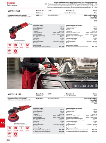 Technische %u00c4nderungen. Preis%u00e4nderungen und Irrtum vorbehalten.Alle Preise verstehen sich als unverbindliche Preisempfehlung exkl. MwSt + vRGSous r%u00e9serve de modifications techniques, de changements de prix et d%u2019erreurs. Tous les prix s%u2018entendent comme prix recommand%u00e9s sans engagement, HT + TAR324Zubeh%u00f6r Metalloberfl%u00e4chen-BearbeitungAccessoires Traitement de surface m%u00e9talliqueZubeh%u00f6r / Accessoires TRINOXFLEX / BSE / BRE / BBE 14-3Schleifvorsatz SatinierenAdaptateur de pon%u00e7age pour satinageRabattcodeCode de remise2Schleifvorsatz mit integriertem Handgriff zum Satinieren f%u00fcr die TRINOXFLEX. Werkzeuglos %u00fcber das Schnellwechselsystem montierbar.Adaptateur de pon%u00e7age avec poign%u00e9e int%u00e9gr%u00e9e pour la satineuse TRINOXFLEX. Montage possible sans outil via le syst%u00e8me de changement rapide.BezeichnungD%u00e9signationBestell-Nr.R%u00e9f%u00e9renceVEUEPreis PrixBS 100433.4621346.%u2013Schleifvorsatz RohrbandAdaptateur de pon%u00e7age %u00e0 bande pour tubesRabattcodeCode de remise2Schleifvorsatz zum Rohrbandschleifen f%u00fcr die TRINOXFLEX.Werkzeuglos %u00fcber das Schnellwechselystem montierbar. Vorsatz variabel verstellbar.Adaptateur de pon%u00e7age %u00e0 des fins de pon%u00e7age %u00e0 bande pour tubes pour TRINOXFLEX. Montage possible sans outil via le syst%u00e8me de changement rapide. Adaptateur %u00e0 r%u00e9glage variable.BezeichnungD%u00e9signationBestell-Nr.R%u00e9f%u00e9renceVEUEPreis PrixBR 125433.47011%u2018050.%u2013Schleifvorsatz B%u00fcrstenAdaptateur de pon%u00e7age brossageRabattcodeCode de remise2Schleifvorsatz zum B%u00fcrsten f%u00fcr die TRINOXFLEX. Mit abnehmbarer Schutzhaube und Absauganschluss %u00d8 32 mm f%u00fcr staubarmes Arbeiten. Inklusive F%u00fchrungsanschlag und vibrationsged%u00e4mpftem ergonomischen Handgriff. Werkzeugloser Schleifwerkzeugwechsel %u00fcber patentiertes Schnellwechselsystem.Adaptateur de pon%u00e7age pour la brosseuse TRINOXFLEX.Avec carter de protection amovible et raccord d%u2019aspiration de 32 mm de diam%u00e8tre pour un travail peu poussi%u00e9reux. Avec but%u00e9e de guidage et poign%u00e9e ergonomique antivibratoire. Changement d%u2019outil de pon%u00e7age sans outil gr%u00e2ce au syst%u00e8me brevet%u00e9 de changement rapide.BezeichnungD%u00e9signationBestell-Nr.R%u00e9f%u00e9renceVEUEPreis PrixBB 110461.5551429.%u2013AbsaughaubeJupe d%u2019aspirationRabattcodeCode de remise2Absaughaube f%u00fcr die BSE 14-3 100 mit Absauganschluss (Clip D32) f%u00fcr Walzen und B%u00fcrsten mit max. %u00d8 110 mm.Capot d%u2019aspiration pour BSE 14-3 100 avec raccord d%u2019aspiration (clip D32) pour rouleaux et brosses avec un diam%u00e8tre max. de 110 mm.BezeichnungD%u00e9signationBestell-Nr.R%u00e9f%u00e9renceVEUEPreis PrixBG D 110461.5471127.%u2013B%u00fcrstenleisteInsertsRabattcodeCode de remise2B%u00fcrstenleiste f%u00fcr Absaughaube 461.547.Barrette %u00e0 brosse pour capot d%u2018aspiration 461.547.BezeichnungD%u00e9signationBestell-Nr.R%u00e9f%u00e9renceVEUEPreis PrixBL-S BG461.563122.%u2013GummiluftwalzeCylindre %u00e0 air en caoutchoucRabattcodeCode de remise2Zum gef%u00fchlvollen Schleifen von Konturen.Pour bien poncer les contours.BezeichnungD%u00e9signationBestell-Nr.R%u00e9f%u00e9renceVEUEPreis PrixAS 100x100433.8961111.%u2013