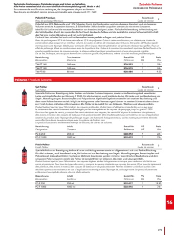 Technische %u00c4nderungen. Preis%u00e4nderungen und Irrtum vorbehalten.Alle Preise verstehen sich als unverbindliche Preisempfehlung exkl. MwSt + vRGSous r%u00e9serve de modifications techniques, de changements de prix et d%u2019erreurs. Tous les prix s%u2018entendent comme prix recommand%u00e9s sans engagement, HT + TAR394Zubeh%u00f6r Metalloberfl%u00e4chen-BearbeitungAccessoires Traitement de surface m%u00e9talliqueSuperfinishing-BandBande de polissage velcro finitionRabattcodeCode de remise2Zum Hochglanzpolieren ohne Poliermittel in zwei Stufen.Pour polir sans produit de polissage en deux %u00e9tapes.BezeichnungD%u00e9signationBandl%u00e4ngeLongueur de bandeBandbreiteLargeur de bandeKornGrainBestell-Nr.R%u00e9f%u00e9renceVEUEPreis Prix760x40 SU-S600760 mm40 mmS 600326.917126.%u2013760x40 SU-S1500760 mm40 mmS 1500326.933126.%u2013Zubeh%u00f6r / Accessoires FBE 8-4 140Schleifarm, 9 mm, spitzBras de pon%u00e7age, 9 mm, en pointeRabattcodeCode de remise2F%u00fcr extrem enge Stellen. Anwendungsf%u00e4lle: Keiln%u00e4hte verschleifen (kleiner Radius), Korrosionsstellen ausschleifen, enge Konturen verschleifen, Kanten entgraten, Treppengel%u00e4nder schleifen, Nut-Zwischenr%u00e4ume bei Nut- und Federbrettern schleifen. Schleifarm verstellbar f%u00fcr Bandl%u00e4ngen 520 mm und 533 mm.Pour utilisation dans des endroits difficiles : Poncer les soudures d%u2018angles (petits rayons), poncer les contours, %u00e9bavurer les ar%u00eates, poncer les balustrades, poncer les espaces entre rainures et coulisseaux. Bras de pon%u00e7age r%u00e9glable pour une longueur de 520 et 533 mm.BezeichnungD%u00e9signationBestell-Nr.R%u00e9f%u00e9renceVEUEPreis PrixSA 9-S256.5251102.%u2013Schleifarm, 9 mm, balligBras de pon%u00e7age, 9 mm, convexeRabattcodeCode de remise2F%u00fcr Winkel und enge Stellen. Anwendungsf%u00e4lle: Keiln%u00e4hte verschleifen (grosser Radius), Kanten entgraten, Treppengel%u00e4nder schleifen, Nut-Zwischenr%u00e4umebei Nut-und Federbrettern schleifen. Schleifarm verstellbar f%u00fcr Bandl%u00e4ngen 520 mm und 533 mm.Pour utilisation dans les angles et les endroits difficiles : Poncer les soudures d%u2018angle (grand rayon), %u00e9bavurer les ar%u00eates, poncer les balustrades, poncer les espaces entre rainures et coulisseaux. Bras de pon%u00e7age r%u00e9glable pour une longueur de 520 et 533 mm.BezeichnungD%u00e9signationBestell-Nr.R%u00e9f%u00e9renceVEUEPreis PrixSA 9-B256.5321102.%u2013Schleifarm, 30 mm, grosse RolleBras de pon%u00e7age, 30 mm, grande poulieRabattcodeCode de remise2F%u00fcr Rohre und Rundungen. Anwendungsf%u00e4lle: Schweissn%u00e4hte an Rohren verschleifen, Radien und %u00dcberg%u00e4nge verschleifen, entgraten. Schleifarm verstellbar f%u00fcr Bandl%u00e4ngen 520 mm und 533 mm.Pour utilisation sur tubes et arrondis : Poncer les soudures sur tubes, poncer rayons et jonctions, %u00e9bavurer. Bras de pon%u00e7age r%u00e9glable pour une longueur de 520 et 533 mm.BezeichnungD%u00e9signationBestell-Nr.R%u00e9f%u00e9renceVEUEPreis PrixSA 30-GR258.8881136.%u2013Polierpaste, Poli whiteP%u00e2te de polissage Poli whiteRabattcodeCode de remise2Vorschleifpaste weiss, Riegel ca. 700 Gramm.P%u00e2te %u00e0 d%u00e9grossir blanche, pain d%u2018env. 700 grammes.BezeichnungD%u00e9signationGewichtPoidsBestell-Nr.R%u00e9f%u00e9renceVEUEPreis PrixPW Inox VS/W0.7 kg255.004113.50Polierpaste Poli blueP%u00e2te de polissage Poli blueRabattcodeCode de remise2Hochglanzpaste blau, Riegel ca. 700 Gramm.P%u00e2te pour polissage brillant, bleue, pain d%u2018env. 700 grammes.BezeichnungD%u00e9signationGewichtPoidsBestell-Nr.R%u00e9f%u00e9renceVEUEPreis PrixPW Inox NS/B0.7 kg255.005117.50