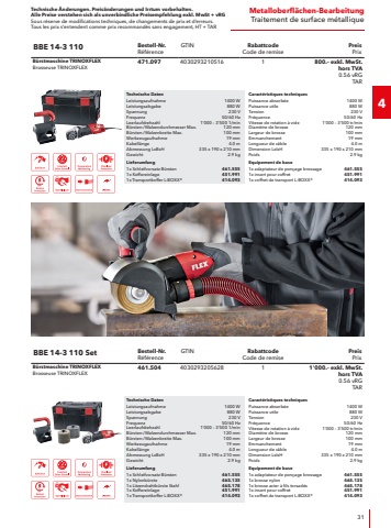 Technische %u00c4nderungen. Preis%u00e4nderungen und Irrtum vorbehalten.Alle Preise verstehen sich als unverbindliche Preisempfehlung exkl. MwSt + vRGSous r%u00e9serve de modifications techniques, de changements de prix et d%u2019erreurs. Tous les prix s%u2018entendent comme prix recommand%u00e9s sans engagement, HT + TAR152WinkelschleiferMeuleses d%u2018angleTechnische DatenLeistungsaufnahme2600 WLeistungsabgabe1800 WSpannung230 VFrequenz50/60 HzMax. Scheibendurchmesser230 mmLeerlaufdrehzahl6%u2018500 1/minSchnitttiefe60 mmWerkzeugaufnahmeM14Kabell%u00e4nge4.0 mAbmessung LxBxH610 x 195 x 290 mmGewicht9.18 kgLieferumfang1x Trenn-Absaughaube f%u00fcr grosseWinkelschleifer 230 mm471.8951x Diamantjet %u2013 DiamanttrennscheibeUniversal500.7203x Gummileiste494.5931x Distanzring494.6151x SoftVib-Handgriff325.3841x Spannmutter M14100.0801x Innensechskantschl%u00fcssel, SW 6104.1671x Stirnlochschl%u00fcssel, BL 5100.1101x Spannflansch335.2821x Transportkoffer499.579Caract%u00e9ristiques techniquesPuissance absorb%u00e9e2600 WPuissance utile1800 WTension230 VFr%u00e9quence50/60 HzDiam%u00e8tre de disque max.230 mmVitesse de rotation %u00e0 vide6%u2018500 tr/minProfondeur de coupe60 mmEmmanchementM14Longueur de c%u00e2ble4.0 mDimension LxlxH610 x 195 x 290 mmPoids9.18 kgEquipement de base1x carter de tron%u00e7onnage pour l%u2018aspirationde poussi%u00e8re avec meuleuse 230 mm471.8951x diamantjet %u2013 Disque de tron%u00e7onnagediamant%u00e9 universel500.7203x inserts en caoutchouc494.5931x rondelle d%u2018%u00e9cartement494.6151x poign%u00e9e SoftVib325.3841x ecrou de serrage M14100.0801x cl%u00e9 %u00e0 hex, SW 6104.1671x cl%u00e9 %u00e0 ergots, BL 5100.1101x bride de serrage335.2821x coffret de transport499.579DCG L 26-6 230 SetBestell-Nr.R%u00e9f%u00e9renceGTINRabattcodeCode de remisePreisPrixDiamant-Trennsystem, 230 mmSyst%u00e8me de d%u00e9coupe diamant, 230 mm494.63140302932241481640.%u2013 exkl. MwSt. hors TVA 2.31 vRGTARTechnische DatenLeistungsaufnahme2600 WLeistungsabgabe1800 WSpannung230 VFrequenz50/60 HzMax. Scheibendurchmesser230 mmLeerlaufdrehzahl6%u2018500 1/minSchnitttiefe60 mmWerkzeugaufnahmeM14Kabell%u00e4nge4.0 mAbmessung LxBxH610 x 195 x 290 mmGewicht9.18 kgLieferumfang1x Trenn-Absaughaube f%u00fcr grosseWinkelschleifer 230 mm471.8951x Diamantjet %u2013 DiamanttrennscheibeUniversal500.7201x F%u00fchrungsschiene GRS 80353.2803x Gummileiste494.5931x Distanzring494.6151x SoftVib-Handgriff325.3841x Spannmutter M14100.0801x Innensechskantschl%u00fcssel, SW 6104.1671x Stirnlochschl%u00fcssel, BL 5100.1101x Spannflansch335.2821x Transportkoffer499.579Caract%u00e9ristiques techniquesPuissance absorb%u00e9e2600 WPuissance utile1800 WTension230 VFr%u00e9quence50/60 HzDiam%u00e8tre de disque max.230 mmVitesse de rotation %u00e0 vide6%u2018500 tr/minProfondeur de coupe60 mmEmmanchementM14Longueur de c%u00e2ble4.0 mDimension LxlxH610 x 195 x 290 mmPoids9.18 kgEquipement de base1x carter de tron%u00e7onnage pour l%u2018aspirationde poussi%u00e8re avec meuleuse 230 mm471.8951x diamantjet %u2013 Disque de tron%u00e7onnagediamant%u00e9 universel500.7201x rail de guidage GRS 80353.2803x inserts en caoutchouc494.5931x rondelle d%u2018%u00e9cartement494.6151x poign%u00e9e SoftVib325.3841x ecrou de serrage M14100.0801x cl%u00e9 %u00e0 hex, SW 6104.1671x cl%u00e9 %u00e0 ergots, BL 5100.1101x bride de serrage335.2821x coffret de transport499.579DCG L 26-6 230 G-SetBestell-Nr.R%u00e9f%u00e9renceGTINRabattcodeCode de remisePreisPrixDiamant-Trennsystem, 230 mmSyst%u00e8me de d%u00e9coupe diamant, 230 mm494.67440302932241551720.%u2013 exkl. MwSt. hors TVA 2.31 vRGTAR