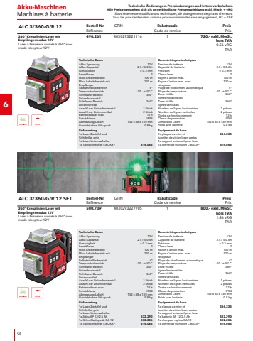 Technische %u00c4nderungen. Preis%u00e4nderungen und Irrtum vorbehalten.Alle Preise verstehen sich als unverbindliche Preisempfehlung exkl. MwSt + vRGSous r%u00e9serve de modifications techniques, de changements de prix et d%u2019erreurs. Tous les prix s%u2018entendent comme prix recommand%u00e9s sans engagement, HT + TAR10WinkelschleiferMeuleses d%u2018angle2Technische DatenLeistungsaufnahme900 WLeistungsabgabe600 WSpannung230 VFrequenz50/60 HzMax. Scheibendurchmesser125 mmLeerlaufdrehzahl11%u2018500 1/minWerkzeugaufnahmeM14Kabell%u00e4nge4.0 mAbmessung LxBxH300 x 75 x 105 mmGewicht2.0 kgLieferumfang1x Schutzhaube Schleifen436.8601x Spannflansch335.2821x Spannmutter M14100.0801x Stirnlochschl%u00fcssel, BL 5100.1101x Handgriff450.774Caract%u00e9ristiques techniquesPuissance absorb%u00e9e900 WPuissance utile600 WTension230 VFr%u00e9quence50/60 HzDiam%u00e8tre de disque max.125 mmVitesse de rotation %u00e0 vide11%u2018500 tr/minEmmanchementM14Longueur de c%u00e2ble4.0 mDimension LxlxH300 x 75 x 105 mmPoids2.0 kgEquipement de base1x carter de protection du pon%u00e7age436.8601x bride de serrage335.2821x ecrou de serrage M14100.0801x cl%u00e9 %u00e0 ergots, BL 5100.1101x poign%u00e9e450.774L 9-11 125Bestell-Nr.R%u00e9f%u00e9renceGTINRabattcodeCode de remisePreisPrix900 Watt Winkelschleifer, 125 mmMeuleuse d%u2018angle 900 Watt, 125 mm492.53140302932228921140.%u2013 exkl. MwSt. hors TVA 0.56 vRGTARTechnische DatenLeistungsaufnahme900 WLeistungsabgabe600 WSpannung230 VFrequenz50/60 HzMax. Scheibendurchmesser125 mmLeerlaufdrehzahl6%u2018000 %u2013 11%u2018500 1/minWerkzeugaufnahmeM14Kabell%u00e4nge4.0 mAbmessung LxBxH300 x 75 x 105 mmGewicht2.0 kgLieferumfang1x Schutzhaube Schleifen436.8601x Spannflansch335.2821x Spannmutter M14100.0801x Stirnlochschl%u00fcssel, BL 5100.1101x Handgriff450.774Caract%u00e9ristiques techniquesPuissance absorb%u00e9e900 WPuissance utile600 WTension230 VFr%u00e9quence50/60 HzDiam%u00e8tre de disque max.125 mmVitesse de rotation %u00e0 vide11%u2018500 tr/minEmmanchementM14Longueur de c%u00e2ble4.0 mDimension LxlxH300 x 75 x 105 mmPoids2.0 kgEquipement de base1x carter de protection du pon%u00e7age436.8601x bride de serrage335.2821x ecrou de serrage M14100.0801x cl%u00e9 %u00e0 ergots, BL 5100.1101x poign%u00e9e450.774LE 9-11 125Bestell-Nr.R%u00e9f%u00e9renceGTINRabattcodeCode de remisePreisPrix900 Watt Winkelschleifer mit variabler Drehzahl, 125 mmMeuleuse d%u2018angle 900 Watt,usage universel, 125 mm436.29140302931891331165.%u2013 exkl. MwSt. hors TVA 0.56 vRGTARTechnische DatenLeistungsaufnahme900 WLeistungsabgabe600 WSpannung230 VFrequenz50/60 HzMax. Scheibendurchmesser125 mmLeerlaufdrehzahl11%u2018500 1/minWerkzeugaufnahmeM14Kabell%u00e4nge4.0 mAbmessung LxBxH300 x 75 x 105 mmGewicht2.0 kgLieferumfang1x Schutzhaube Schleifen436.8601x Spannflansch335.2821x Spannmutter M14100.0801x Stirnlochschl%u00fcssel, BL 5100.1101x Handgriff450.7741x Koffereinlage414.2041x Transportkoffer L-BOXX%u00ae414.085Caract%u00e9ristiques techniquesPuissance absorb%u00e9e900 WPuissance utile600 WTension230 VFr%u00e9quence50/60 HzDiam%u00e8tre de disque max.125 mmVitesse de rotation %u00e0 vide11%u2018500 tr/minEmmanchementM14Longueur de c%u00e2ble4.0 mDimension LxlxH300 x 75 x 105 mmPoids2.0 kgEquipement de base1x carter de protection du pon%u00e7age436.8601x bride de serrage335.2821x ecrou de serrage M14100.0801x cl%u00e9 %u00e0 ergots, BL 5100.1101x poign%u00e9e450.7741x insert pour coffret414.2041x coffret de transport L-BOXX%u00ae414.085LE 9-11 125 L-BOXXBestell-Nr.R%u00e9f%u00e9renceGTINRabattcodeCode de remisePreisPrix900 Watt Winkelschleifer mit variabler Drehzahl, 125 mmMeuleuse d%u2018angle 900 Watt,usage universel, 125 mm436.73940302931895081215.%u2013 exkl. MwSt. hors TVA 0.56 vRGTAR