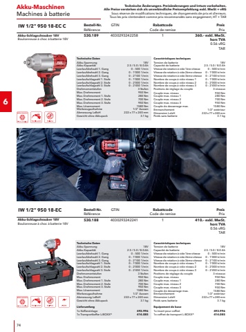 Technische %u00c4nderungen. Preis%u00e4nderungen und Irrtum vorbehalten.Alle Preise verstehen sich als unverbindliche Preisempfehlung exkl. MwSt + vRGSous r%u00e9serve de modifications techniques, de changements de prix et d%u2019erreurs. Tous les prix s%u2018entendent comme prix recommand%u00e9s sans engagement, HT + TAR264Metalloberfl%u00e4chen-BearbeitungTraitement de surface m%u00e9talliqueTechnische DatenLeistungsaufnahme800 WLeistungsabgabe425 WSpannung230 VFrequenz50/60 HzB%u00fcrsten-/Walzendurchmesser Max.125 mmB%u00fcrsten-/Walzenbreite Max.50 mmLeerlaufdrehzahl1%u2018400 %u2013 4%u2018000 1/minWerkzeugaufnahme19 mmKabell%u00e4nge4.0 mAbmessung LxBxH320 x 210 x 195 mmGewicht2.3 kgLieferumfang1x Schleifvorsatz Satinieren459.5771x Innensechskantschl%u00fcssel102.229Caract%u00e9ristiques techniquesPuissance absorb%u00e9e800 WPuissance utile425 WTension230 VFr%u00e9quence50/60 HzDiam%u00e8tre de brosse125 mmLargeur de brosse50 mmVitesse de rotation %u00e0 vide1%u2018400 %u2013 4%u2018000 tr/minEmmanchement19 mmLongueur de c%u00e2ble4.0 mDimension LxlxH320 x 210 x 195 mmPoids2.3 kgEquipement de base1x adaptateur de pon%u00e7age pour satinage459.5771x cl%u00e9 hex102.229BSE 8-4 50Bestell-Nr.R%u00e9f%u00e9renceGTINRabattcodeCode de remisePreisPrixSatiniermaschine TRINOXFLEXSatineuse TRINOXFLEX453.40440302932010261590.%u2013 exkl. MwSt. hors TVA 0.56 vRGTARTechnische DatenLeistungsaufnahme800 WLeistungsabgabe425 WSpannung230 VFrequenz50/60 HzBandgeschwindigkeit3 %u2013 8 m/secLeerlaufdrehzahl1%u2018400 %u2013 4%u2018000 1/minBandl%u00e4nge533 mmBandbreite4 / 9 / 30 mmGeeignetf%u00fcrmax.Rohrdurchmesser50 mmKabell%u00e4nge4.0 mAbmessung LxBxH320 x 210 x 195 mmGewicht2.7 kgLieferumfang1x Schleifvorsatz Rohrband459.5852x Schleifband ZIRCOFLEX257.1052x Schleifband ZIRCOFLEX257.1021x Innensechskantschl%u00fcssel, SW 4102.2291x Innensechskantschl%u00fcssel, SW 6104.1671x Koffereinlage457.3371x Transportkoffer L-BOXX%u00ae414.085Caract%u00e9ristiques techniquesPuissance absorb%u00e9e800 WPuissance utile425 WTension230 VFr%u00e9quence50/60 HzVitesse de bande3 %u2013 8 m/secVitesse de rotation %u00e0 vide1%u2018400 %u2013 4%u2018000 tr/minLongueur de bande533 mmLargeur de bande4 / 9 / 30 mmPour diam%u00e8tre de tube max.50 mmLongueur de c%u00e2ble4.0 mDimension LxlxH320 x 210 x 195 mmPoids2.7 kgEquipement de base1x adaptateurdepon%u00e7age%u00e0bandepourtubes457.5852x bande abrasive ZIRCOFLEX257.1052x bande abrasive ZIRCOFLEX257.1021x cl%u00e9 hex, SW 4102.2291x cl%u00e9 hex, SW 6104.1671x insert pour coffret457.3371x coffret de transport L-BOXX%u00ae414.085BRE 8-4 9Bestell-Nr.R%u00e9f%u00e9renceGTINRabattcodeCode de remisePreisPrixRohrbandschleiferTRINOXFLEX im SetPonceuse %u00e0 bande pour tubesTRINOXFLEX en set453.42040302932010401850.%u2013 exkl. MwSt. hors TVA 0.56 vRGTAR
