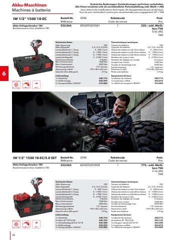 Technische %u00c4nderungen. Preis%u00e4nderungen und Irrtum vorbehalten.Alle Preise verstehen sich als unverbindliche Preisempfehlung exkl. MwSt + vRGSous r%u00e9serve de modifications techniques, de changements de prix et d%u2019erreurs. Tous les prix s%u2018entendent comme prix recommand%u00e9s sans engagement, HT + TAR284Metalloberfl%u00e4chen-BearbeitungTraitement de surface m%u00e9talliqueTechnische DatenLeistungsaufnahme1400 WLeistungsabgabe880 WSpannung230 VFrequenz50/60 HzLeerlaufdrehzahl1%u2018000 %u2013 3%u2018500 1/minMax. Werkzeugdurchmesser125 mmMax. Werkzeugbreite100 mmKabell%u00e4nge4.0 mKabeltyproter SteckerGewicht2.1 kgCaract%u00e9ristiques techniquesPuissance absorb%u00e9e1400 WPuissance utile880 WTension230 VFr%u00e9quence50/60 HzVitesse de rotation %u00e0 vide1%u2018000 %u2013 3%u2018500 tr/minDiam%u00e8tre d%u2018outil max.125 mmLargeur d%u2018outil max.100 mmLongueur de c%u00e2ble4.0 mType de c%u00e2bleFicher rougePoids2.1 kgBME 14-3 LBestell-Nr.R%u00e9f%u00e9renceGTINRabattcodeCode de remisePreisPrixBasismotor TRINOXFLEXMoteur de base TRINOXFLEX433.40340302931871601400.%u2013 exkl. MwSt. hors TVA 0.56 vRGTARTechnische DatenLeistungsaufnahme1400 WLeistungsabgabe880 WSpannung230 VFrequenz50/60 HzB%u00fcrsten-/Walzendurchmesser Max.125 mmB%u00fcrsten-/Walzenbreite Max.100 mmLeerlaufdrehzahl1%u2018000 %u2013 3%u2018500 1/minWerkzeugaufnahme19 mmKabell%u00e4nge4.0 mAbmessung LxBxH320 x 210 x 195 mmGewicht2.9 kgLieferumfang1x Schleifvorsatz Satinieren433.462Caract%u00e9ristiques techniquesPuissance absorb%u00e9e1400 WPuissance utile880 WTension230 VFr%u00e9quence50/60 HzDiam%u00e8tre de brosse125 mmLargeur de brosse100 mmVitesse de rotation %u00e0 vide1%u2018000 %u2013 3%u2018500 tr/minEmmanchement19 mmLongueur de c%u00e2ble4.0 mDimension LxlxH320 x 210 x 195 mmPoids2.9 kgEquipement de base1x adaptateur de pon%u00e7age pour satinage433.462BSE 14-3 100Bestell-Nr.R%u00e9f%u00e9renceGTINRabattcodeCode de remisePreisPrixSatiniermaschine TRINOXFLEXSatineuse TRINOXFLEX433.41140302931871771615.%u2013 exkl. MwSt. hors TVA 0.56 vRGTAR