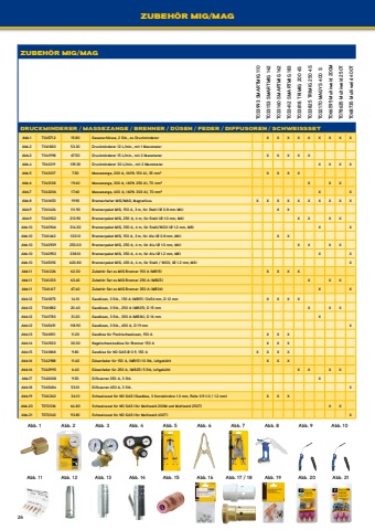 24ZUBEH%u00d6R MIG/MAGZUBEH%u00d6R MIG/MAGT033993 SMARTMIG 110 T033153 SMARTMIG 142 T033160 SMARTMIG 162 T033412 SMARTMIG 183 T033818 TRIMIG 200 4S T033825 TRIMIG 250 4S T032170 MAGYS 400 S T066595 Multiweld 200M T078635 Multiweld 250T T068735 Multiweld 400TDRUCKMINDERER / MASSEZANGE / BRENNER / D%u00dcSEN / FEDER / DIFFUSOREN / SCHWEISSSETAbb.1 T045712 15.80 Gasanschl%u00fcsse, 2 Stk., zu Druckminderer X X X X X X X X XAbb.2 T041820 53.30 Druckminderer 12 L/min., mit 1 ManometerAbb.3 T041998 67.50 Druckminderer 15 L/min., mit 2 Manometer X X X X XAbb.4 T041219 139.30 Druckminderer 30 L/min., mit 2 Manometer X X X XAbb.5 T043107 7.50 Massezange, 200 A, (60% 150 A), 35 mm%u00b2 X X X XAbb.6 T043138 19.40 Massezange, 300 A, (60% 250 A), 70 mm%u00b2 X X XAbb.7 T043206 17.60 Massezange, 400 A, (60% 300 A), 70 mm%u00b2 X XAbb.8 T041653 19.90 Brennerhalter MIG/MAG, Magnetfuss X X X X X X X X X XAbb.9 T041424 111.90 Brennerpaket MIG, 150 A, 3 m, f%u00fcr Stahl (%u00d8 0.8 mm-M6) X XAbb.9 T040922 213.90 Brennerpaket MIG, 250 A, 4 m, f%u00fcr Stahl (%u00d8 1.0 mm, M6) X X X XAbb.10 T040946 314.30 Brennerpaket MIG, 350 A, 4 m, f%u00fcr Stahl/INOX (%u00d8 1.2 mm, M8) X XAbb.10 T041462 133.10 Brennerpaket MIG, 150 A, 3 m, f%u00fcr Alu (%u00d8 0.8 mm, M6) X XAbb.10 T040939 253.00 Brennerpaket MIG, 250 A, 4 m, f%u00fcr Alu (%u00d8 1.0 mm, M6) X X X XAbb.10 T040953 338.10 Brennerpaket MIG, 350 A, 4 m, f%u00fcr Alu (%u00d8 1.2 mm, M8) X XAbb.10 T045392 620.80 Brennerpaket MIG, 450 A, 4 m, f%u00fcr Stahl / INOX, (%u00d8 1.2 mm, M8) XAbb.11 T041226 62.30 Zubeh%u00f6r Set zu MIG Brenner 150 A (MB15) X X X XAbb.11 T041233 63.40 Zubeh%u00f6r Set zu MIG Brenner 250 A (MB25) X X XAbb.11 T041417 67.40 Zubeh%u00f6r Set zu MIG Brenner 350 A (MB36) X XAbb.12 T041875 14.10 Gasd%u00fcsen, 3 Stk., 150 A (MB15) 13x54 mm, D 12 mm X X X XAbb.12 T041882 20.40 Gasd%u00fcsen, 3 Stk., 250 A (MB25), D 15 mm X X XAbb.12 T041783 31.20 Gasd%u00fcsen, 3 Stk., 350 A (MB36), D 16 mm XAbb.12 T045491 118.90 Gasd%u00fcsen, 3 Stk., 450 A, D 19 mm XAbb.13 T041851 11.20 Gasd%u00fcse f%u00fcr Punktschweissen, 150 A X X XAbb.14 T041523 30.30 Nagelschweissd%u00fcse f%u00fcr Brenner 150 A X X XAbb.15 T041868 9.80 Gasd%u00fcse f%u00fcr NO GAS %u00d8 0.9, 150 A X X X XAbb.16 T042988 11.40 D%u00fcsenfeder f%u00fcr 150 A, (MB15) 10 Stk, luftgek%u00fchlt X X XAbb.16 T042995 6.40 D%u00fcsenfeder f%u00fcr 250 A, (MB25) 5 Stk, luftgek%u00fchlt X X X XAbb.17 T043008 9.50 Diffusoren 350 A, 3 Stk. XAbb.18 T045484 53.10 Diffusoren 450 A, 3 Stk. XAbb.19 T041240 34.10 Schweissset f%u00fcr NO GAS (Gasd%u00fcse, 3 Kontaktrohre 1.0 mm, Rolle 0.9-1.0 / 1.2 mm) X X XAbb.20 T072336 64.80 Schweissset f%u00fcr NO GAS (f%u00fcr Multiweld 200M und Multiweld 250T) X XAbb.21 T072343 93.80 Schweissset f%u00fcr NO GAS (f%u00fcr Multiweld 400T) XAbb. 1 Abb. 2 Abb. 3 Abb. 4 Abb. 5 Abb. 6 Abb. 7 Abb. 8 Abb. 9 Abb. 10Abb. 11 Abb. 12 Abb. 13 Abb. 14 Abb. 15 Abb. 16 Abb. 17 / 18 Abb. 19 Abb. 20 Abb. 21