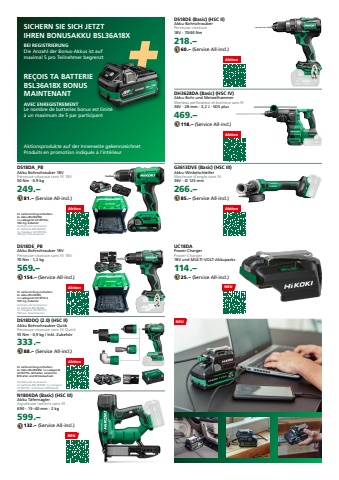 Fokus Magazin/Magazine FocusAusgabe 2 %u2013 2025/%u00c9dition 2 %u2013 2025Laufzeit vom 1. Oktober 2025 bis 31. M%u00e4rz 2026/Valable du 1er octobre 2025 au 31 mars 2026Preise in CHF, exkl. MWST/Prix en CHF, hors TVAIhr HiKOKI-Fachh%u00e4ndler:Votre revendeur HiKOKI agr%u00e9%u00e9 :Aktionsprodukte auf der Innenseite gekennzeichnetProduits en promotion indiqu%u00e9s %u00e0 l'int%u00e9rieurDie Anzahl der Bonus-Akkus ist auf maximal 5 pro Teilnehmer begrenztLe nombre de batteries bonus est limit%u00e9 %u00e0 un maximum de 5 par participant1.Kaufen Sie ein HiKOKI-Ger%u00e4t aus der AktionAchetez un appareil HiKOKI issu de la promotion2.Scannen Sie die H%u00e4ndler-Rechnung mit Seriennummer und senden Sie diese mit Betreff \info@revotool.chScannez la facture du revendeur avec le num%u00e9ro de s%u00e9rie et envoyez-la avec pour objet %u00ab Promotion batterie gratuite %u00bb %u00e0 : info@revotool.ch3.Sichern Sie sich Ihren kostenlosen MultiVolt-Akku BSL36A18XObtenez gratuitement votre batterie MultiVolt BSL36A18XNEUCV18DMA (Basic) (HSC II)Akku-Multitool Starlock MaxOutil multifonction sans fil Starlock Max18V - 1,3 kg - 4,0%u00b0349.%u2013 77.%u2013 (Service All-incl.)NEUSWAP.CLICK.GO.NEUMAKETHE CUTC3609DUM (Basic)Akku-Handkreiss%u00e4geScie circulaire %u00e0 main sans fil36V - 85 mm - 5,6 kg711.%u2013 156.%u2013 (Service All-incl.)NEU%u2022 Einh%u00e4ndiger und werkzeugloser Werkzeugwechsel%u2022 Starlock MAX: kompatibel mit s%u00e4mtlichem StarlockZubeh%u00f6r%u2022 Ergonomisch: UVP, vibrationsarm, schlanker GriffumfangBEZEICHNUNG ART.-NR. PREISF%u00fchrungsschienenF%u00fchrungsschiene GR800 (L%u00e4nge 80 cm)4100071 105.%u2013F%u00fchrungsschiene GR1600 (L%u00e4nge 160 cm)4100072 164.%u2013Kompatibles Zubeh%u00f6rBEZEICHNUNG ART.-NR. PREISErweitertes Magazin (4 Nagelstreifen) 382819 195.%u2013Stifte f%u00fcr Beton2.6 x 20 mm 4100461 105.%u20132.6 x 25 mm 4100462 110.%u20132.6 x 30 mm 4100463 123.%u20132.6 x 35 mm 4100464 135.%u20132.6 x 40 mm 4100465 160.%u2013Stifte f%u00fcr Hartbeton und Stahl3.0 x 15 mm 4100467 98.%u20133.0 x 17 mm 4100468 105.%u20133.0 x 22 mm 4100469 115.%u20133.0 x 27 mm 4100470 125.%u20133.0 x 32 mm 4100471 138.%u20133.0 x 40 mm 4100472 150.%u2013Kompatibles Zubeh%u00f6r%u2022 maximale Schnittkapazit%u00e4t 85 mm%u2022 Drehmoment-Boost f%u00fcr leistungsintensive Schneidarbeiten%u2022 Kompatibel mit F%u00fchrungsschienen vieler MarkenNC1840DA (Basic)Akku-BetonnaglerCloueuse pour b%u00e9ton %u00e0 batterie18V - 15%u201340 mm - 4,1 kg914.%u2013 201.%u2013 (Service All-incl.)NEUJede Schachtel enth%u00e4lt 1000 N%u00e4gel.Aktionsprodukte auf der Innenseite gekennzeichnetProduits en promotion indiqu%u00e9s %u00e0 l'int%u00e9rieurDS18DA_PBAkku Bohrschrauber 18VPerceuse-visseuse sans fil 18V50 Nm - 0.9 kg249 .%u201381.%u2013 (Service All-incl.)AktionIm Lieferumfang enthalten:2%u00d7 Akku BSL1820M, 1%u00d7 Ladeger%u00e4t UC18YKSL, 100-tlg. Zubeh%u00f6rContenu de la livraison:2%u00d7 batterie BSL1820M, 1%u00d7 chargeur UC18YKSL, 100 pcs. d'accessoiresDS18DE_PBAkku Bohrschrauber 18VPerceuse-visseuse sans fil 18V70 Nm - 1,2 kg569.%u2013154.%u2013 (Service All-incl.)AktionIm Lieferumfang enthalten:2%u00d7 Akku BSL3618X, 1%u00d7 Ladeger%u00e4t UC18YSL3, 100-tlg. Zubeh%u00f6rContenu de la livraison:2%u00d7 batterie BSL3618X, 1%u00d7 chargeur UC18YSL3, 100 pcs. d'accessoiresDS18DDQ (2.0) (HSC II)Akku Bohrschrauber QuickPerceuse-visseuse sans fil Quick55 Nm - 0,9 kg / Inkl. Zubeh%u00f6r333.%u201388.%u2013 (Service All-incl.)AktionIm Lieferumfang enthalten:2%u00d7 Akku BSL1820M, 1%u00d7 Ladeger%u00e4t UC18YFSL, Bithalter, versetzter Bithalter und WinkelaufsatzContenu de la livraison:2%u00d7 batterie BSL1820M, 1%u00d7 chargeur UC18YFSL, 4 embouts diff%u00e9rentsN1804DA (Basic) (HSC III)Akku T%u00e4fernaglerAgrafeuse lambris sans filK90 - 13%u201340 mm - 2 kg599.%u2013 132.%u2013 (Service All-incl.)NEUDS18DE (Basic) (HSC II)Akku-BohrschrauberPerceuse-visseuse18V - 70/40 Nm218 .%u201360.%u2013 (Service All-incl.)AktionDH3628DA (Basic) (HSC IV)Akku-Bohr und MeisselhammerMarteau perforateur et burineur sans fil36V - 28 mm - 3,2 J - SDS plus469 .%u2013118.%u2013 (Service All-incl.)AktionG3613DVE (Basic) (HSC III)Akku-WinkelschleiferMeuleuse d'angle sans fil36V - %u00d8 125 mm266 .%u201385.%u2013 (Service All-incl.)AktionNEUUC18DAPower-ChargerPower-Charger18V und MULTI-VOLT-Akkupacks114.%u2013 25.%u2013 (Service All-incl.)NEURE%u00c7OIS TA BATTERIE BSL36A18X BONUS MAINTENANTAVEC ENREGISTREMENTLe nombre de batteries bonus est limit%u00e9 %u00e0 un maximum de 5 par participantSICHERN SIE SICH JETZT IHREN BONUSAKKU BSL36A18XBEI REGISTRIERUNGDie Anzahl der Bonus-Akkus ist auf maximal 5 pro Teilnehmer begrenztSICHERN SIE SICH JETZT IHREN BONUSAKKU BSL36A18XRE%u00c7OIS TA BATTERIE BSL36A18X BONUS MAINTENANT