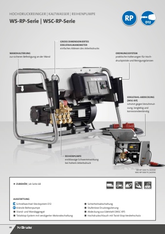 22Profi 160 TST | 606002Profi-SerieD12HOCHDRUCKREINIGER | KALTWASSERKOMFORTABLE SCHLAUCHTROMMELplatzsparende Aufbewahrung des Hochdruckschlauchs mit Twist-Stop Verdrehschutz ORDNUNGSSYSTEMpraktisches Verstauen von Hochdruckpistole und ReinigungslanzenGROSS DIMENSIONIERTES EDELSTAHLMANOMETER einfaches Ablesen des ArbeitsdrucksROTO-MOLD-CHASSISpraktisch unzerst%u00f6rbares Kunststoff-Geh%u00e4useGEL%u00c4NDEG%u00c4NGIGES FAHRWERKrobustes Fahrgestell f%u00fcr leichten Transport und hohe Standsicherheit%u25a0Optional: Wasserkasten (nicht im Lieferumfang enthalten)%u25a0Direktansaugung: Ansaugh%u00f6he 2.5 m%u25a0Hochdruckschlauch mit Twist-Stop VerdrehschutzAUSSTATTUNGSchnellwechsel-Stecksystem D12%u25a0Kr%u00e4nzle Axialpumpe%u25a0Totalstop-System%u25a0Stufenlose Druckregulierung %u25ba ZUBEH%u00d6R Seite 26-274-POLIGER ELEKTROMOTOR - 1.400 U/minreduziert die Ger%u00e4uschentwicklungund den Verschlei%u00df