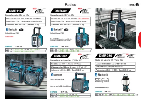 123DMR115DMR115MR004GDMR301ZDMR301DMR202DMR202Ah Ah 12V 1.5 / 2.0 / 4.0 14.4V 1.5 / 3.0 / 6.0Ah Ah 18V 1.5 / 2.0 / 3.0 / 4.0 / 5.0 / 6.0 Ah Ah 12V 1.5 / 2.0 / 4.0 14.4V 1.5 / 3.0 / 6.0Ah Ah 18V 1.5 / 2.0 / 3.0 / 4.0 / 5.0 / 6.0 Ah A 12V 1.5 / 2.0 / 4.0 14.4V 1.5 Ah Ah 18V 1.5 / 2.0 / 3.0 / 4.0 / 5.0 / 6.0 DMR056DMR056Ah Ah 14.4V : 1.5 18V : 1.5 / 2.0 / 3.0 / 4.0 / 5.0 / 6.0DMR115DMR202HOMEF%u00fcr 230V und 7.2V, 12V, 14.4V und 18V AkkusDAB / DAB+ / FM / 2 Aux-In Anschl%u00fcsse f%u00fcr MP3Autonomie mit 6 Ah : 20 h / Gewicht 4.78 kgSchutzklasse IP64Baustellenradio 12V bis 18VF%u00fcr 230V und 12V, 14.4V und 18V Akkus / Mit LadefunktionDAB / DAB+ / FM / Aux-In und USB Anschl%u00fcsseAutonomie mit 6 Ah : 24 h / Gewicht 5.97 kgBaustellenradio 12V bis 18VDer LCD-Bildschirm zeigt den Ladezustand des Akkus an !Baustellen-Lautsprecher 12V bis 18VF%u00fcr 230V und 12V, 14.4V und 18V Akkus%u00d8 Lautsprecher 100 und 36 mm / 10 W mit 18VAutonomie mit 6 Ah : 22 h / Gewicht 2.68 kgRadiosSubwooferSchutzklasse IP64Schutzklasse IP64Aux-In und USB Anschl%u00fcsseLumen 95/200/300 / Lux lx* 55/140/1000DAB/DAB+/FM / Mit USB-AnschlussAutonomie mit 6 Ah : 14-53 h / Gewicht 0.98 kgRadio mit Laterne 14.4V und 18VSchutzklasse IP654 Modi : 360%u00b0, 180%u00b0, Taschenlampe und Stroboscop-Modus CHF 285.- CHF 439.-CHF 185.- CHF 219.-