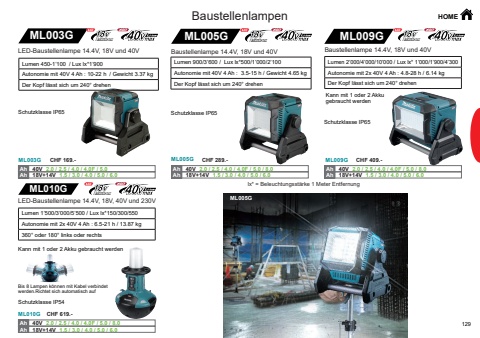 129ML009GML003G ML009GML003GML005GML005GML010GML010GML005GAh Ah 40V 2.0 / 2.5 / 4.0 / 4.0F / 5.0Ah Ah 18V+14V 1.5 / 3.0 / 4.0 / 5.0 / 6.0 Ah Ah 40V 2.0 / 2.5 / 4.0 / 4.0F / 5.0 / 8.0Ah Ah 18V+14V 1.5 / 3.0 / 4.0 / 5.0 / 6.0 Ah Ah 40V 2.0 / 2.5 / 4.0 / 4.0F / 5.0 / 8.0Ah Ah 18V+14V 1.5 / 3.0 / 4.0 / 5.0 / 6.0 Ah Ah 40V 2.0 / 2.5 / 4.0 / 4.0F / 5.0 / 8.0Ah Ah 18V+14V 1.5 / 3.0 / 4.0 / 5.0 / 6.0 Baustellenlampen HOMELumen 2%u2019000/4%u2019000/10%u2019000 / Lux lx* 1%u2019000/1%u2019900/4%u2019300 Autonomie mit 2x 40V 4 Ah : 4.8-28 h / 6.14 kgDer Kopf l%u00e4sst sich um 240%u00b0 drehenLED-Baustellenlampe 14.4V, 18V und 40V Baustellenlampe 14.4V, 18V und 40VLumen 450-1%u2019100 / Lux lx*1%u2019900Autonomie mit 40V 4 Ah : 10-22 h / Gewicht 3.37 kgDer Kopf l%u00e4sst sich um 240%u00b0 drehenBaustellenlampe 14.4V, 18V und 40VLumen 900/3%u2019600 / Lux lx*500/1%u2019000/2%u2019100 Autonomie mit 40V 4 Ah : 3.5-15 h / Gewicht 4.65 kgDer Kopf l%u00e4sst sich um 240%u00b0 drehenLumen 1%u2019500/3%u2019000/5%u2019500 / Lux lx*150/300/550Autonomie mit 2x 40V 4 Ah : 6.5-21 h / 13.87 kg360%u00b0 oder 180%u00b0 links oder rechts LED-Baustellenlampe 14.4V, 18V, 40V und 230VBis 8 Lampen k%u00f6nnen mit Kabel verbindet werden.Richtet sich automatisch aufSchutzklasse IP54Schutzklasse IP65 Schutzklasse IP65Schutzklasse IP65Kann mit 1 oder 2 Akku gebraucht werdenKann mit 1 oder 2 Akku gebraucht werdenlx* = Beleuchtungsst%u00e4rke 1 Meter EntfernungCHF 169.- CHF 289.- CHF 409.-CHF 619.-