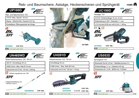 169UP100DUP100DZAh Ah 1.5 / 2.0 / 4.0 / 5.0 UC100DUC100DZAh Ah 1.5 / 2.0 / 4.0UN460WDUN460WDZAh Ah 1.5 / 2.0 / 3.0 / 4.0 / 5.0 UH201D1x 2.0 AhUH201DZUH201DSAAh Ah 1.5 / 2.0 / 3.0 / 4.0 / 5.0 US053DUS053DZAh Ah 1.5 / 2.0 / 4.0UC100DReb- und Baumschere, Asts%u00e4ge, Heckenscheren und Spr%u00fchger%u00e4t HOMEReb- und Baumschere 12V170 W / Max. %u00c4ste %u00d8 : 25 mm Masse : 305x43x106 / Gewicht 0.67 kgEinstellbarer %u00d6ffnungswinkel der KlingeAsts%u00e4ge 12V210 W / Schienenl%u00e4nge 10 cm / 8 m/sKettenteilung 0.325\219 Schnitte %u00d8 50 mm mit 6.0 Ah / 1.08 kg200 W / Schnittl%u00e4nge 46 cm 3%u2019600 U/min / Max. %u00c4ste %u00d8 18 mm Autonomie mit 4.0 Ah : 53 min / 2.66 kgStab-Heckenschere 12V 46 cmWinkel regulierbar auf 135%u00b0L%u00e4ngeneinstellung von1.90 bis 2.50 mSchnittl%u00e4nge 20 cm 2%u2019500 U/min / Max. %u00c4ste %u00d8 8 mmAutonomie mit 4.0 Ah : 90 min / 1.20 kgHeckenschere 12V 20 cm Spr%u00fchger%u00e4t 12VMaximaler Druck 3.0 bar / Beh%u00e4ltervolumen 5 L Schlauchl%u00e4nge 1.7 m / Gewicht 2.67 kgAutonomie mit 1.5 Ah : 80/95 min / 2 D%u00fcsenReb- und Baumschere, Asts%u00e4geHeckenscheren und Spr%u00fch- ger%u00e4tCHF 679.- CHF 199.-CHF 209.- CHF 185.-CHF 105.-CHF 249.-