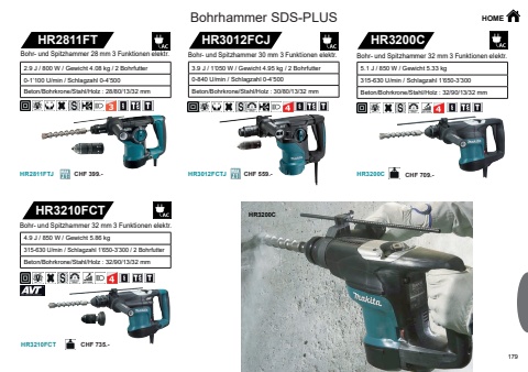 179HR3012FCJHR3012FCTJHR3200CHR3200CHR3210FCTHR3210FCTHR2811FTHR2811FTJHR3200CCHF 559.- CHF 709.-CHF 735.-CHF 399.-HOME3.9 J / 1%u2019050 W / Gewicht 4.95 kg / 2 Bohrfutter0-840 U/min / Schlagzahl 0-4%u2019500Beton/Bohrkrone/Stahl/Holz : 30/80/13/32 mmBohr- und Spitzhammer 30 mm 3 Funktionen elektr.5.1 J / 850 W / Gewicht 5.33 kg315-630 U/min / Schlagzahl 1%u2019650-3%u2019300Beton/Bohrkrone/Stahl/Holz : 32/90/13/32 mmBohr- und Spitzhammer 32 mm 3 Funktionen elektr.Bohr- und Spitzhammer 32 mm 3 Funktionen elektr.4.9 J / 850 W / Gewicht 5.86 kg315-630 U/min / Schlagzahl 1%u2019650-3%u2019300 / 2 BohrfutterBeton/Bohrkrone/Stahl/Holz : 32/90/13/32 mmBohrhammer SDS-PLUS2.9 J / 800 W / Gewicht 4.08 kg / 2 Bohrfutter0-1%u2019100 U/min / Schlagzahl 0-4%u2019500 Beton/Bohrkrone/Stahl/Holz : 28/80/13/32 mmBohr- und Spitzhammer 28 mm 3 Funktionen elektr.