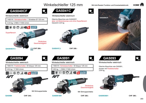 203GA5040CFGA5040CFJGA5041CGA5041CJGA5094GA5094GA5091GA5091X01GA5093GA5093X01GA5040CFCHF 299.- CHF 309.-CHF 245.- CHF 285.- CHF 295.-Winkelschleifer 125 mm HOME1%u2019400 W / Schiebeschalter / Scheiben %u00d8 125 mm 3.03 kg / 2%u2019800-11%u2019000 U/minWinkelschleifer elektrischSuperflanschStufenloseGeschwindigkeit1%u2019900 W / Paddelschalter / %u00d8 disque 125 mm3.64 kg / 11%u2019500 U/minWinkelschleifer elektrisch Winkelschleifer elektrisch1%u2019900 W / Schiebeschalter / %u00d8 disque 125 mm3.60 kg / 2%u2019800-11%u2019500 U/minStufenloseGeschwindigkeitMit Schruppscheibe Mit SchruppscheibeMit Anti-Restart Funktion und KonstantelektronikWinkelschleifer elektrischGleiche Maschine wie GA5091, ausser mit Paddelschalter 3.64 kgGleiche Maschine wie GA040CF, aber mit Motorbremse und ohne SuperflanschGewicht 3.24 kgWinkelschleifer elektrisch