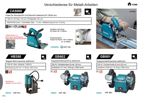 210CA5000XJArt. B-48860CA5000GB602GB602GB801HB350 GB801HB350CA5000CHF 725.-CHF 815.- CHF 199.- CHF 295.-Verschiedenes f%u00fcr Metall-Arbeiten HOMEFr%u00e4se f%u00fcr Alucobond%u00ae und Dibond%u00ae elektrisch %u00d8 118/20 mm1%u2019300 W / %u00d8 Fr%u00e4se 118 mm / %u00d8 S%u00e4geblatt 165 mm 2%u2019600-6%u2019400 U/min / Schnittleist. Max. : 11 mm / Blattbohrung 20 mm / 5.25 kg 2 Maschinen in 1 : kann auch als EintauchKreiss%u00e4ge gebraucht werden !Geliefert mit Fr%u00e4ser f%u00fcr Nuten 90%u00b0 6 Z%u00e4hne Sonderzubeh%u00f6r :Fr%u00e4ser f%u00fcr Nuten 135%u00b0 6 Z%u00e4hne250 W / Schleifscheibe %u00d8 max 150 mmAufnahme 12.7 mm / 8.95 kg / 2%u2019850 U/minDoppelschleifmaschine elektrisch550 W / Schleifscheibe %u00d8 max 205 mmAufnahme 15.88 mm / 19.18 kg / 2%u2019850 U/minMagnet-Bohrmaschine elektrisch Doppelschleifmaschine elektrisch1%u2019050 W / Max. Setzkraft : 8%u2019000 NBohrleistung 35 mm / 11.98 kg / 850 U/minAufnahme : Weldon 19 mm (3/4\