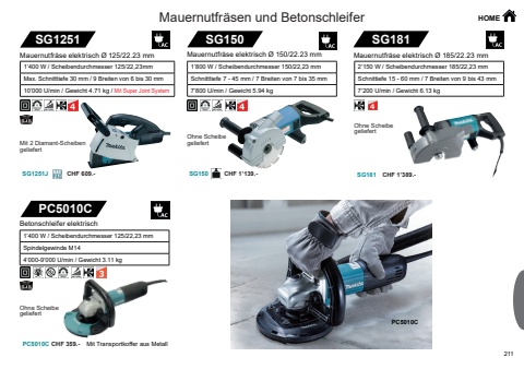 211PC5010CSG1251SG1251JSG150SG150 SG181PC5010CPC5010CCHF 609.- CHF 1%u2019139.- CHF 1%u2019389.-CHF 359.-Mauernutfr%u00e4sen und Betonschleifer HOMEMit 2 Diamant-Scheibengeliefert1%u2019400 W / Scheibendurchmesser 125/22,23mm Max. Schnitttiefe 30 mm / 9 Breiten von 6 bis 30 mm 10%u2019000 U/min / Gewicht 4.71 kg / Mit Super Joint SystemMauernutfr%u00e4se elektrisch %u00d8 150/22.23 mm1%u2019800 W / Scheibendurchmesser 150/22,23 mmSchnitttiefe 7 - 45 mm / 7 Breiten von 7 bis 35 mm 7%u2019800 U/min / Gewicht 5.94 kgMauernutfr%u00e4se elektrisch %u00d8 125/22.23 mmOhne Scheibe geliefertOhne Scheibe geliefertMauernutfr%u00e4se elektrisch %u00d8 185/22.23 mm2%u2019150 W / Scheibendurchmesser 185/22,23 mmSchnittiefe 15 - 60 mm / 7 Breiten von 9 bis 43 mm7%u2019200 U/min / Gewicht 6.13 kgBetonschleifer elektrisch1%u2019400 W / Scheibendurchmesser 125/22,23 mmSpindelgewinde M14 4%u2019000-9%u2019000 U/min / Gewicht 3.11 kgOhne Scheibe geliefertSG181Mit Transportkoffer aus Metall