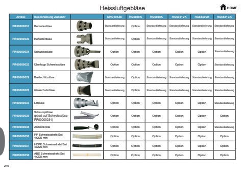 216Heissluftgebl%u00e4se HOMEArtikel Beschreibung Zubeh%u00f6r DHG181ZK HG5030K HG6030K HG6031VK HG6530VK HG6531CKPR00000031 Reduzierd%u00fcse Standardlieferung Option Standardlieferung Standardlieferung Standardlieferung StandardlieferungPR00000030 Reflektord%u00fcse Standardlieferung Option Standardlieferung Standardlieferung Standardlieferung StandardlieferungPR00000034 Schweissd%u00fcse Option Option Option Option Option StandardlieferungPR00000032 %u00dcberlapp Schweissd%u00fcse Option Option Option Option Option StandardlieferungPR00000029 Breitschlitzd%u00fcse Standardlieferung Option Standardlieferung Standardlieferung Standardlieferung StandardlieferungPR00000028 Glasschutzd%u00fcse Standardlieferung Option Standardlieferung Standardlieferung Standardlieferung StandardlieferungPR00000033 L%u00f6td%u00fcse Option Option Option Option Option StandardlieferungPR00000039Schrumpfd%u00fcse (passt auf Schweissd%u00fcse PR00000034)Option Option Option Option Option OptionPR00000035 Andr%u00fcckrolle Option Option Option Option Option StandardlieferungPR00000038 PP Schweissdraht Set 4x225 mm Option Option Option Option Option OptionPR00000037 HDPE Schweissdraht Set 4x225 mm Option Option Option Option Option OptionPR00000036 ABS Schweissdraht Set 4x225 mm Option Option Option Option Option Option