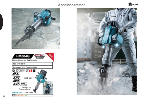 HOME28HM004GHM004GZ0128.6 mmAh Ah 4.0F / 5.0 / 8.0AbbruchhammerAbbruchhammer 2x40V=80V72.8 J / 4%u2019400 WSchlagzahl 870 / Poids 28.25 kgGeliefert mit Transportkarre !CHF 2%u2019339.-