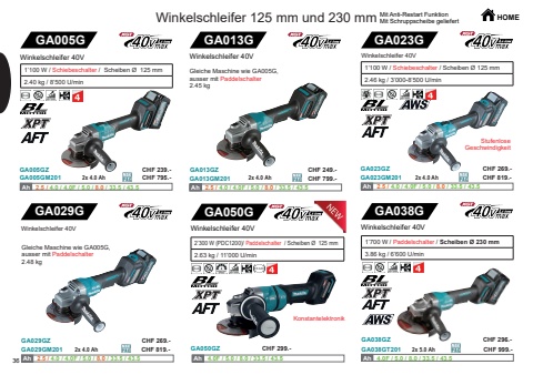 HOME36GA005G GA013GGA005GZGA005GM201GA013GZ2x 4.0 Ah GA013GM201 2x 4.0 AhGA050GGA050GZGA023GGA029GGA023GZGA023GM201 2x 4.0 AhGA029GZGA029GM201 2x 4.0 AhAh Ah 2.5 / 4.0 / 4.0F / 5.0 / 8.0 / 33.5 / 43.5 Ah Ah 2.5 / 4.0 / 4.0F / 5.0 / 8.0 / 33.5 / 43.5 Ah Ah 2.5 / 4.0 / 4.0F / 5.0 / 8.0 / 33.5 / 43.5Ah Ah 2.5 / 4.0 / 4.0F / 5.0 / 8.0 / 33.5 / 43.5 Ah Ah 4.0F / 5.0 / 8.0 / 33.5 / 43.5GA038GGA038GZGA038GT201 2x 5.0 AhAh Ah 4.0F / 5.0 / 8.0 / 33.5 / 43.5Winkelschleifer 125 mm und 230 mmWinkelschleifer 40V 1%u2019100 W / Schiebeschalter / Scheiben %u00d8 125 mm2.40 kg / 8%u2019500 U/min2%u2019300 W (PDC1200)/ Paddelschalter / Scheiben %u00d8 125 mm2.63 kg / 11%u2019000 U/minWinkelschleifer 40V Winkelschleifer 40V 1%u2019100 W / Schiebeschalter / Scheiben %u00d8 125 mm2.46 kg / 3%u2019000-8%u2019500 U/min StufenloseGeschwindigkeitMit Anti-Restart Funktion Mit Schruppscheibe geliefertKonstantelektronikGleiche Maschine wie GA005G, ausser mit Paddelschalter 2.45 kgGleiche Maschine wie GA005G, ausser mit Paddelschalter 2.48 kgWinkelschleifer 40V Winkelschleifer 40V Winkelschleifer 40V 1%u2019700 W / Paddelschalter / Scheiben %u00d8 230 mm3.86 kg / 6%u2019600 U/minCHF 795.-CHF 239.-CHF 799.-CHF 249.-CHF 299.-CHF 819.-CHF 269.-CHF 819.-CHF 269.-CHF 999.-CHF 296.-