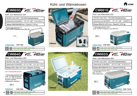 HOME44CW003G CW001GCW002GCW002GZCW003GZ01 CW001GZ017 L 20 L50 LCW004GCW004GZ29 LCW004GCW002GAh Ah 40V 2.0 / 2.5 / 4.0 / 4.0F / 5.0 / 8.0 Ah Ah 18V 1.5 / 3.0 / 4.0 / 5.0 / 6.0 Ah Ah 40V 2.0 / 2.5 / 4.0 / 4.0F / 5.0 / 8.0 Ah Ah 18V 1.5 / 3.0 / 4.0 / 5.0 / 6.0 Ah Ah 40V 2.0 / 2.5 / 4.0 / 4.0F / 5.0 / 8.0 Ah Ah 18V 1.5 / 3.0 / 4.0 / 5.0 / 6.0 Ah Ah 40V 2.0 / 2.5 / 4.0 / 4.0F / 5.0 / 8.0 Ah Ah 18V 1.5 / 3.0 / 4.0 / 5.0 / 6.0 K%u00fchl- und W%u00e4rmeboxen18V/40V oder 230V / 12V-/24V-AutosteckdoseAutonomie (2x BL4040F) : -18%u00b0 /+5%u00b0 /+60%u00b0 : 5.5/13.5/5.5 hMasse 456x245x308 mm / Gewicht 7.64 kgK%u00fchl- und W%u00e4rmebox 40V18V/40V oder 230V / 12V-/24V-AutosteckdoseAutonomie (2x BL4050F) : -18%u00b0 /+5%u00b0 /+60%u00b0 : 10/28/8.5 hMasse 663x341x372 mm / Gewicht 13.64 kgK%u00fchl- und W%u00e4rmebox 40V18V/40V oder 230V / 12V-/24V-Autosteckdose Autonomie (2x BL4050F) : -18%u00b0 /+5%u00b0 /+60%u00b0 : 8 /19.5 /4.5 hMasse 867x465x476 mm / Gewicht 25.60 kgK%u00fchl- und W%u00e4rmebox 40V%u2022 Fassungsvolumen 7 L (z.B. 6 PET-Flaschen von 500 ml)%u2022 Fassungsvolumen 20 L (z.B. 20 PET-Flaschen von 500 ml)%u2022 Fassungsvolumen 50 L z.B. 15 x 2 L PET-Flaschen)18V/40V oder 230V / 12V-/24V-AutosteckdoseAutonomie (2x BL4050F) : 18%u00b0 /+5%u00b0 /+60%u00b0 : 12.5 / 30 / 11.5 hMasse 676 x 345 x 471 mm / Gewicht 18.40 kgK%u00fchl- und W%u00e4rmebox 40Vmit 2 Temperaturzonen%u2022 Fassungsvolumen 29L (z.B. 3 x 350 ml Dosen + 4 x 2 L PET-Flaschen k%u00f6nnen vertikal aufbewahrt werden)CHF 759.- CHF 855.-CHF 945.- CHF 1%u2019419.-