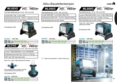 HOME49ML009GML003G ML009GML003GML005GML005GML010GML010GAh Ah 40V 2.0 / 2.5 / 4.0 / 4.0F / 5.0Ah Ah 18V+14V 1.5 / 3.0 / 4.0 / 5.0 / 6.0 Ah Ah 40V 2.0 / 2.5 / 4.0 / 4.0F / 5.0 / 8.0Ah Ah 18V+14V 1.5 / 3.0 / 4.0 / 5.0 / 6.0 Ah Ah 40V 2.0 / 2.5 / 4.0 / 4.0F / 5.0 / 8.0Ah Ah 18V+14V 1.5 / 3.0 / 4.0 / 5.0 / 6.0 Ah Ah 40V 2.0 / 2.5 / 4.0 / 4.0F / 5.0 / 8.0Ah Ah 18V+14V 1.5 / 3.0 / 4.0 / 5.0 / 6.0 Akku-BaustellenlampenLumen 2%u2019000/4%u2019000/10%u2019000 / Lux lx* 1%u2019000/1%u2019900/4%u2019300 Autonomie mit 2x 40V 4 Ah : 4.8-28 h / 6.14 kgDer Kopf l%u00e4sst sich um 240%u00b0 drehenLED-Baustellenlampe 14.4V, 18V und 40V Baustellenlampe 14.4V, 18V und 40VLumen 450-1%u2019100 / Lux lx*1%u2019900Autonomie mit 40V 4 Ah : 10-22 h / Gewicht 3.37 kgDer Kopf l%u00e4sst sich um 240%u00b0 drehenBaustellenlampe 14.4V, 18V und 40VLumen 900/3%u2019600 / Lux lx*500/1%u2019000/2%u2019100 Autonomie mit 40V 4 Ah : 3.5-15 h / Gewicht 4.65 kgDer Kopf l%u00e4sst sich um 240%u00b0 drehenLumen 1%u2019500/3%u2019000/5%u2019500 / Lux lx*150/300/550Autonomie mit 2x 40V 4 Ah : 6.5-21 h / 13.87 kg360%u00b0 oder 180%u00b0 links oder rechts LED-Baustellenlampe 14.4V, 18V, 40V und 230VBis 8 Lampen k%u00f6nnen mit Kabel verbindet werden.Richtet sich automatisch aufSchutzklasse IP54Schutzklasse IP65 Schutzklasse IP65Schutzklasse IP65Kann mit 1 oder 2 Akku gebraucht werdenKann mit 1 oder 2 Akku gebraucht werdenlx* = Beleuchtungsst%u00e4rke 1 Meter EntfernungCHF 169.- CHF 289.- CHF 409.-CHF 619.-