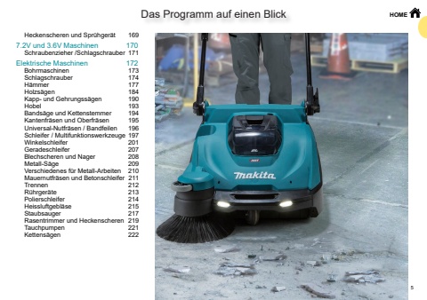 5HOMEHeckenscheren und Spr%u00fchger%u00e4t 1697.2V und 3.6V Maschinen 170Schraubenzieher /Schlagschrauber 171Elektrische Maschinen 172Bohrmaschinen 173Schlagschrauber 174H%u00e4mmer 177Holzs%u00e4gen 184Kapp- und Gehrungss%u00e4gen 190Hobel 193Bands%u00e4ge und Kettenstemmer 194Kantenfr%u00e4sen und Oberfr%u00e4sen 195Universal-Nutfr%u00e4sen / Bandfeilen 196Schleifer / Multifunktionswerkzeuge 197Winkelschleifer 201Geradeschleifer 207Blechscheren und Nager 208Metall-S%u00e4ge 209Verschiedenes f%u00fcr Metall-Arbeiten 210Mauernutfr%u00e4sen und Betonschleifer 211Trennen 212R%u00fchrger%u00e4te 213Polierschleifer 214Heissluftgebl%u00e4se 215Staubsauger 217Rasentrimmer und Heckenscheren 219Tauchpumpen 221Kettens%u00e4gen 222Das Programm auf einen Blick