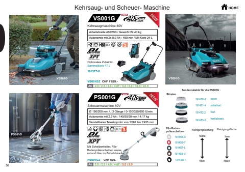 HOME56PS001GPS001GZVS001GVS001GZ1913F7-8VS001GAh Ah 2.0 / 2.5 / 4.0 / 4.0F / 5.0 / 8.0 / 33.5 / 43.5Ah Ah 2.0 / 2.5 / 4.0 / 4.0F / 5.0 / 8.01914T0-61914T1-41914T2-21914T3-01914S5-91914S6-71914S7-51914S8-31914S9-1PS001GVS001GScheuermaschine 40V%u00d8 190/200 mm / / 3 G%u00e4nge / 0-150/350/600 U/min Autonomie mit 2,5 Ah : 140/50/30 min / 4.17 kgVerstellbares Teleskoprohr von 1'081 bis 1'435 mmKehrsaug- und Scheuer- MaschineArbeitsbreite 480/650 / Gewicht 29.40 kgAutonomie mit 2x 8.0 Ah : 480 min / Mit Korb 24 LKehrsaugmaschine 40VSammelkorb 47 LOptionales Zubeh%u00f6r Mit Scheibenhalter, FilzBodenpolierscheiben weiss, rot und blau im Zubeh%u00f6rsack B%u00fcrstenSonderzubeh%u00f6r f%u00fcr die PS001G :weichmittelhartharthart/abrasivFilz-Bodenpolierscheiben Reinigungsleistung Reinigungsfl%u00e4chefaible lissehoch Rauh CHF 605.-CHF 1%u2019599.-