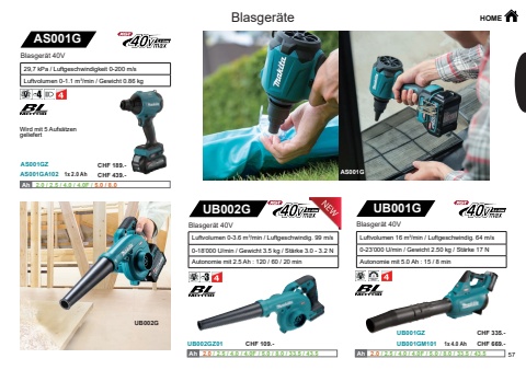 HOME57UB001GZUB001GUB001GM101 1x 4.0 AhUB002GUB002GZ01Ah Ah 2.0 / 2.5 / 4.0 / 4.0F / 5.0 / 8.0 / 33.5 / 43.5 Ah Ah 2.0 / 2.5 / 4.0 / 4.0F / 5.0 / 8.0 / 33.5 / 43.5AS001GAS001GA102AS001GZ1x 2.0 AhAh Ah 2.0 / 2.5 / 4.0 / 4.0F / 5.0 / 8.0AS001GUB002GBlasger%u00e4teLuftvolumen 16 m3/min / Luftgeschwindig. 64 m/s0-23%u2019000 U/min / Gewicht 2.50 kg / St%u00e4rke 17 NAutonomie mit 5.0 Ah : 15 / 8 minBlasger%u00e4t 40VLuftvolumen 0-3.6 m3/min / Luftgeschwindig. 99 m/s0-18%u2019000 U/min / Gewicht 3.5 kg / St%u00e4rke 3.0 - 3.2 NAutonomie mit 2.5 Ah : 120 / 60 / 20 minBlasger%u00e4t 40VWird mit 5 Aufs%u00e4tzen geliefertBlasger%u00e4t 40V29,7 kPa / Luftgeschwindigkeit 0-200 m/s Luftvolumen 0-1.1 m3/min / Gewicht 0.86 kgCHF 335.-CHF 109.- CHF 669.-CHF 439.-CHF 189.-