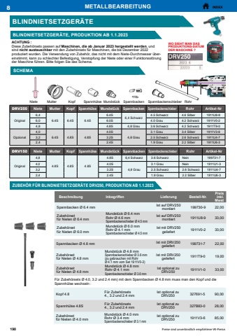 226INDEXPreise sind unverbindlich empfohlene VK-Preise.SCHRAUBENARMIERUNGSEISEN-BINDEHAKENL%u00e4nge (mm)Stk/PkgBestell-Nr.Preis inkl. Mwst1201194731-241,00TIEFENANSCHLAG F%u00dcR SCHRAUBERBeschreibungGeeignet f%u00fcr ModelleBestell-Nr.Preis inkl. MwstTiefenanschlag kurz zu brauchen mit 60 mm Bithalter P-05979FS2300 / FS4300 / FS6300DFS451 / DFS452 / DFS250 DFS251197025-414,00Bithalter magnetisch mit Sicherheitsring60 cm / 1/4\P-0597915,00Bit PH2 standard784211-24,00Beim Eindrehen von der Gewindestange in den Einsatzhalter, bewegen sich die Stifte in dem Halter gegen das Zentrum entlang der Stange und halten sie fest. In dieser Situation ist es einfach die Gewindestange mit Hilfe der H%u00fclse zu schrauben.Gr%u00f6sseStk/PkgBestell-Nr.Preis inkl. MwstM61B-4296128,00M81B-4297729,00M101B-4298330,00VERSCHIEDENES ZUBEH%u00d6REINSATZHALTER F%u00dcR GEWINDESTANGEN